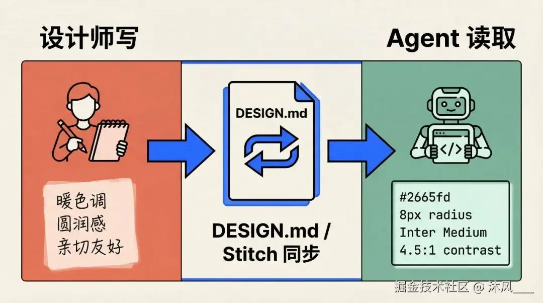 你写 Markdown,Stitch 负责维持两者同步。你可以写得模糊,它帮你翻译成精确值;你也可以写得精确,它原样遵守。
