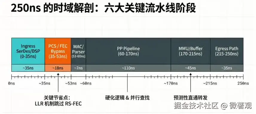 博通通过 Tomahawk Ultra(BCM78920)重新定义了以太网在 Scale-up 领域的地位,传统以太网头开销(46B)在处理 MoE 专家路由信息等小包时极度低效。Tomahawk Ultra 通过AFH将其压缩至10 字节,效率提升 78%,为了降低时延时,博通对芯片各个阶段作了极致优化: