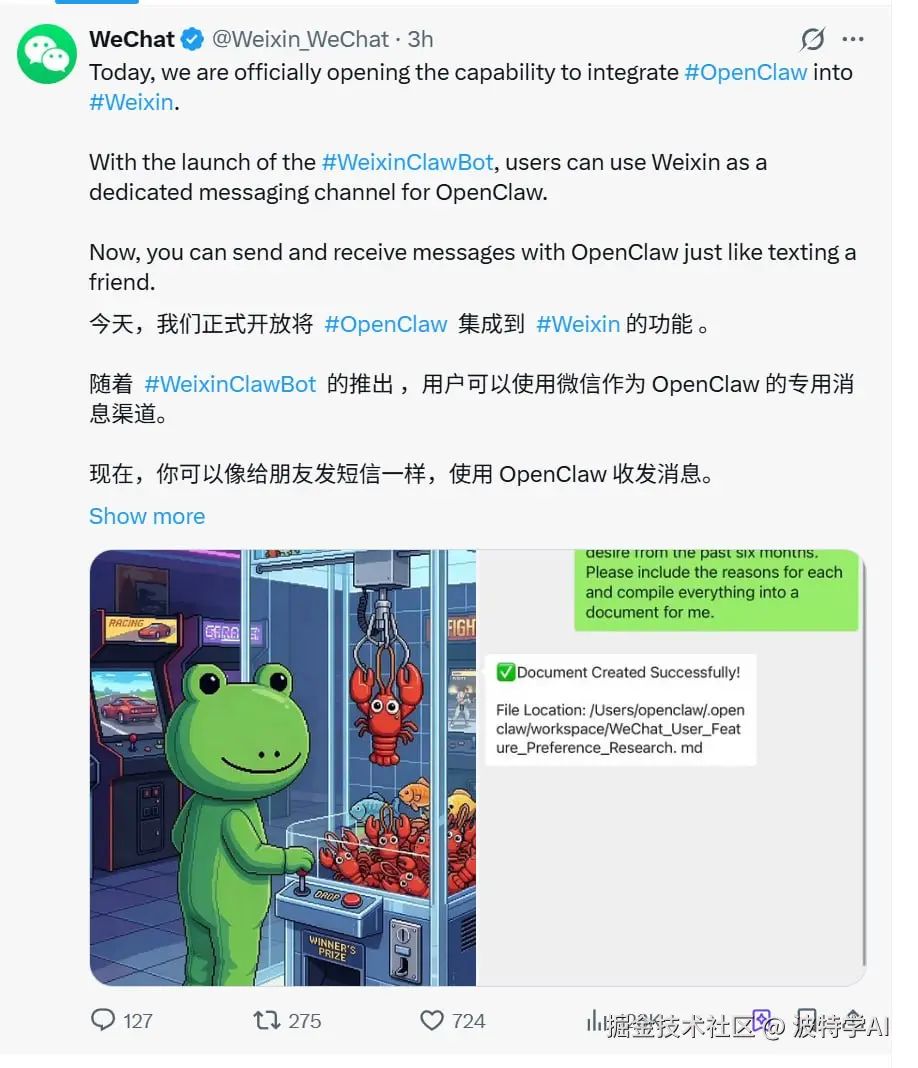 但这件事最值得看的,不是微信开放了 AI 入口。