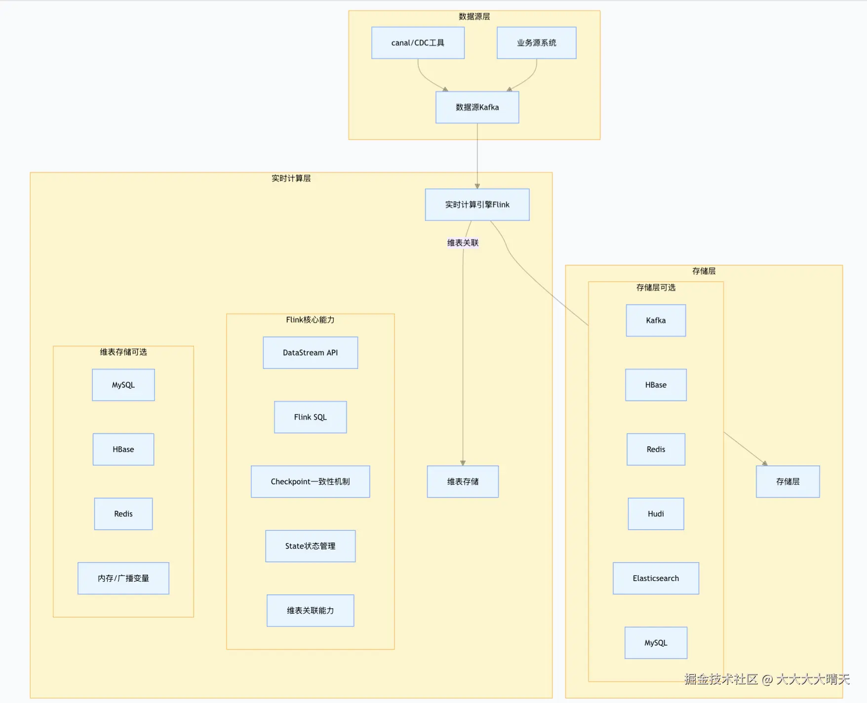 在实时计算链路中,我们通常以 Flink 为核心引擎,消费 CDC 工具(如 Canal/FlinkCDC)或源系统写入 Kafka 的实时数据,经清洗、转换、维表关联后,写入对应存储介质供下游业务使用。