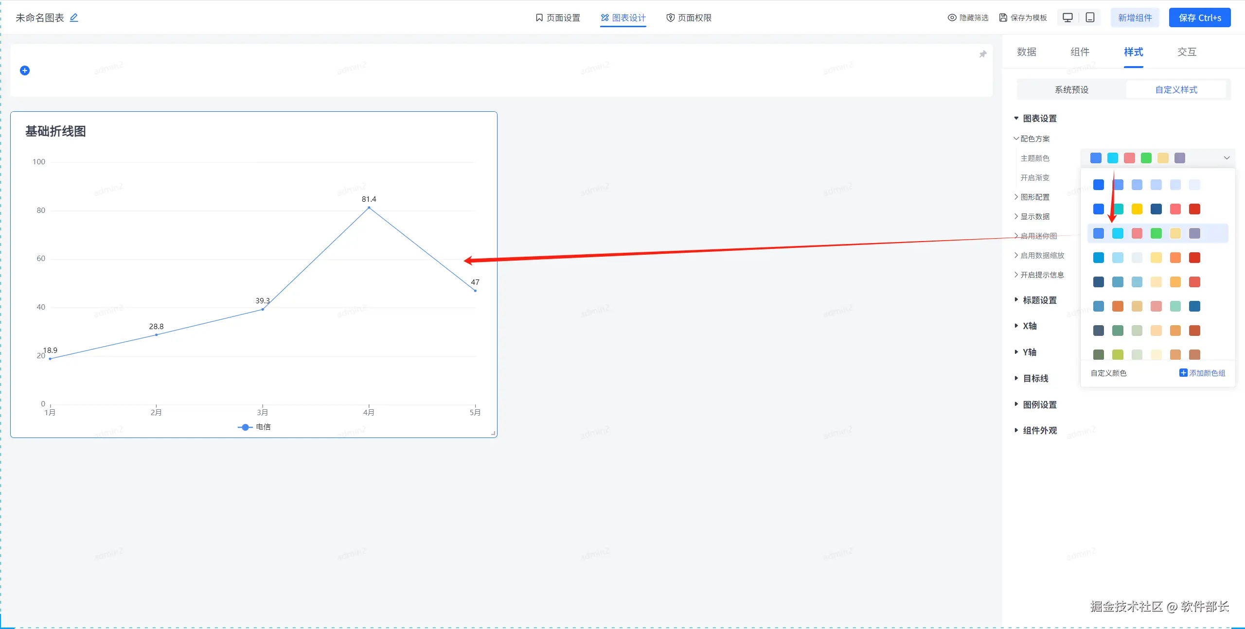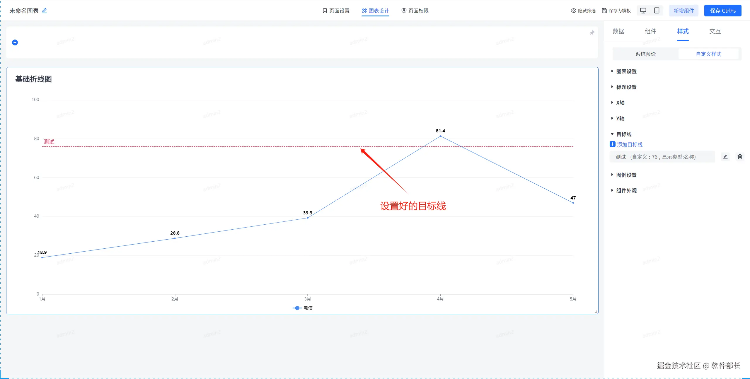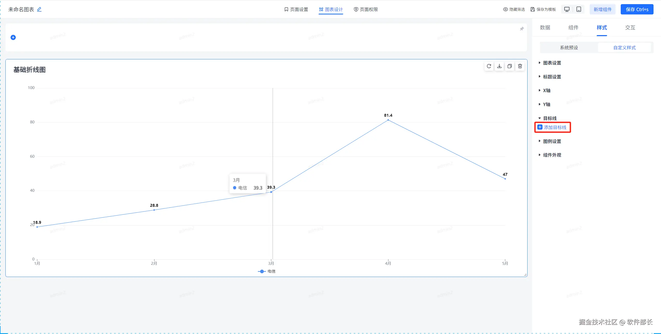 点击选择基础折线图,选择后点击【样式】下的【自定义样式】。就可以看到大致分为【图表设置】、【标题设置】、【X轴】、【Y轴】、【目标线】、【图例设置】、【组件外观】这几个大的模块。