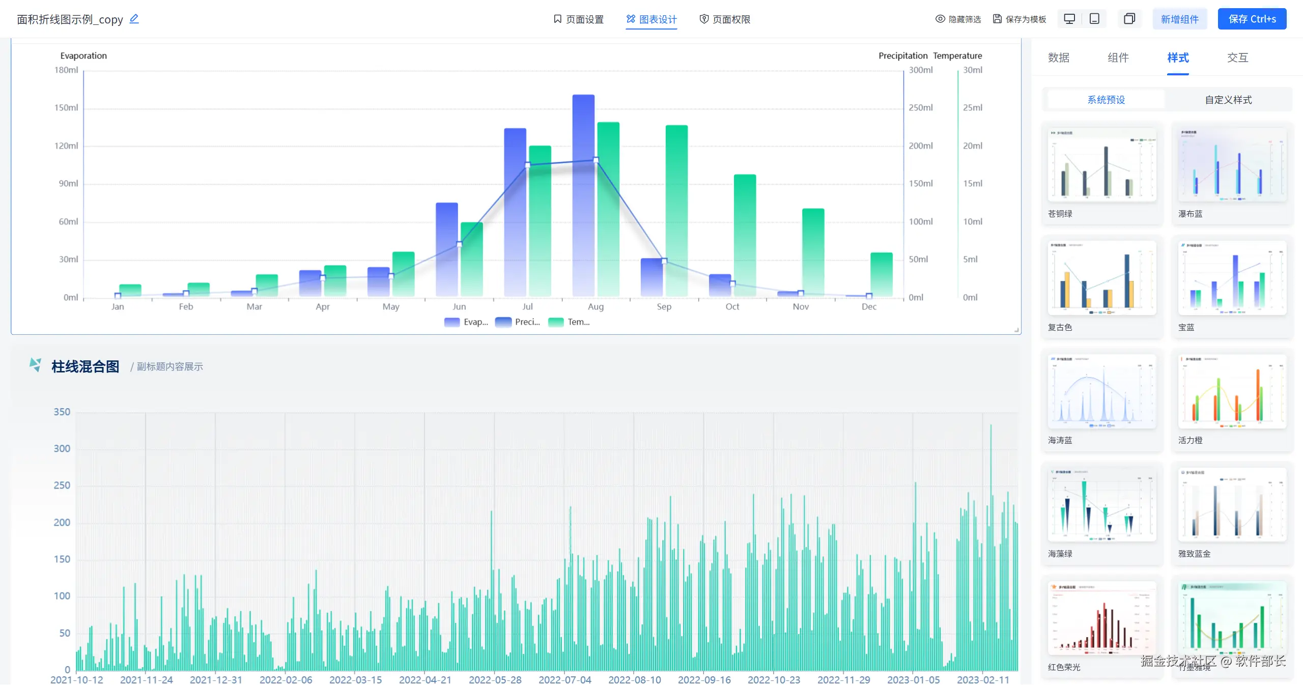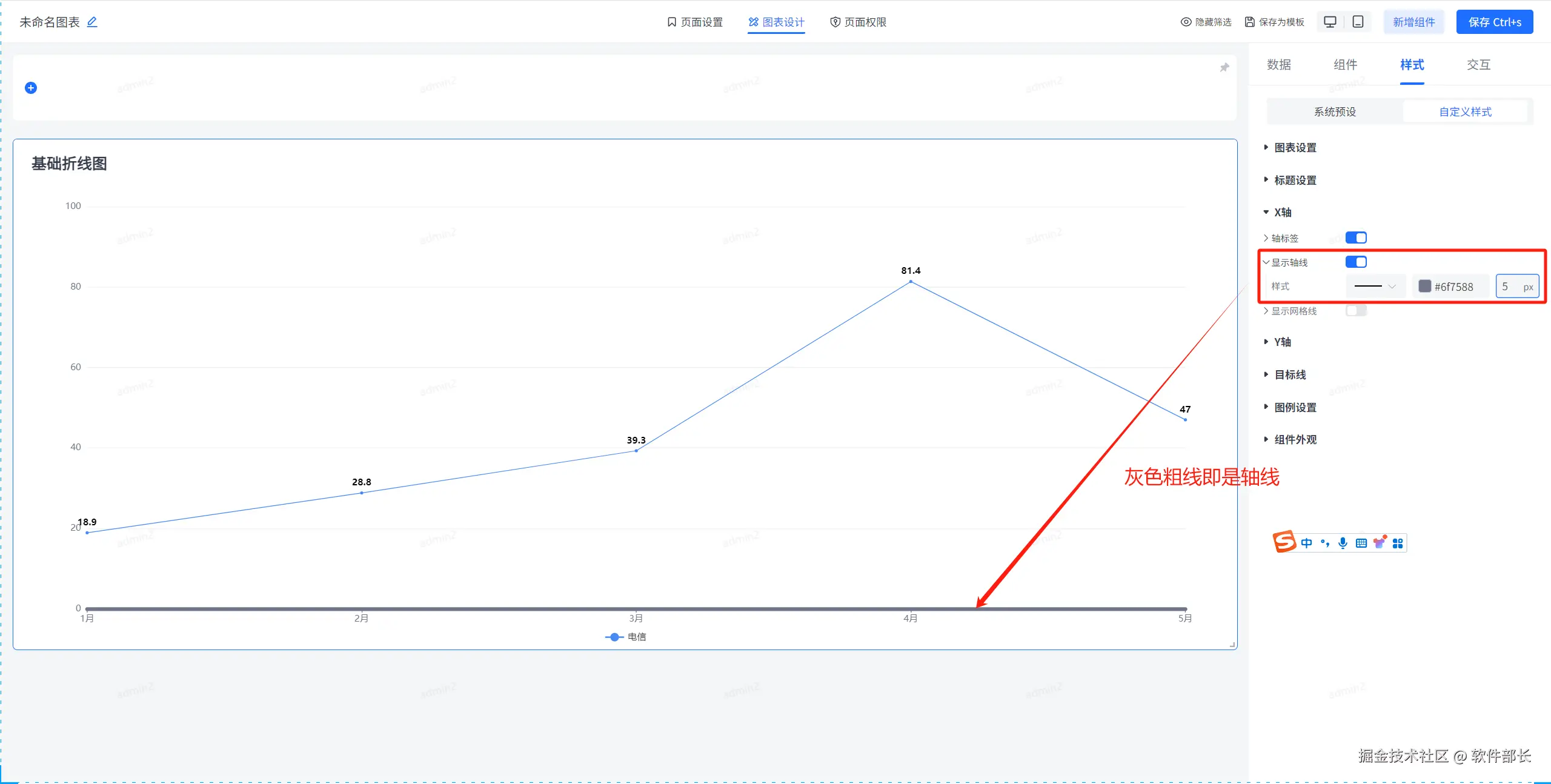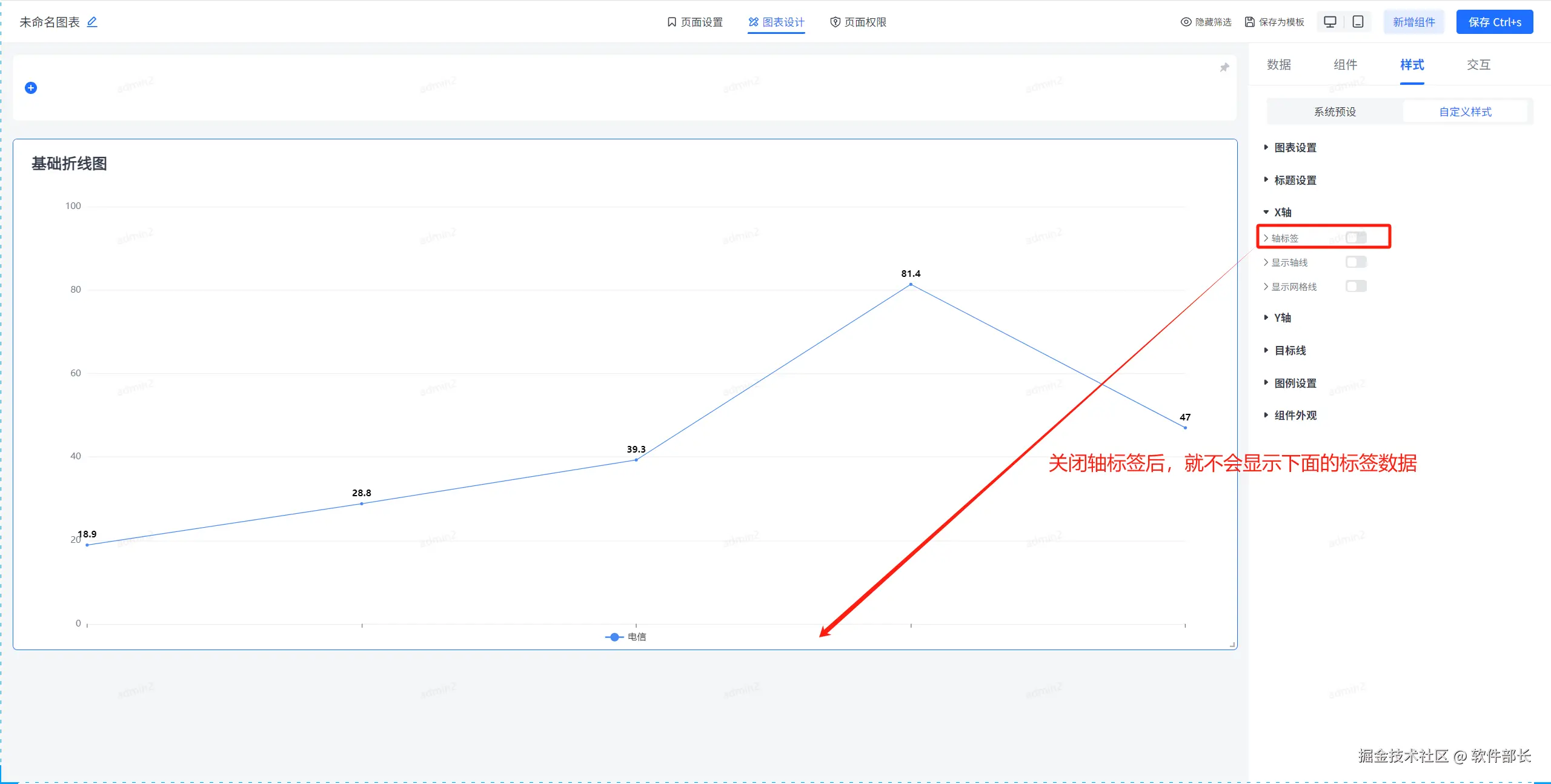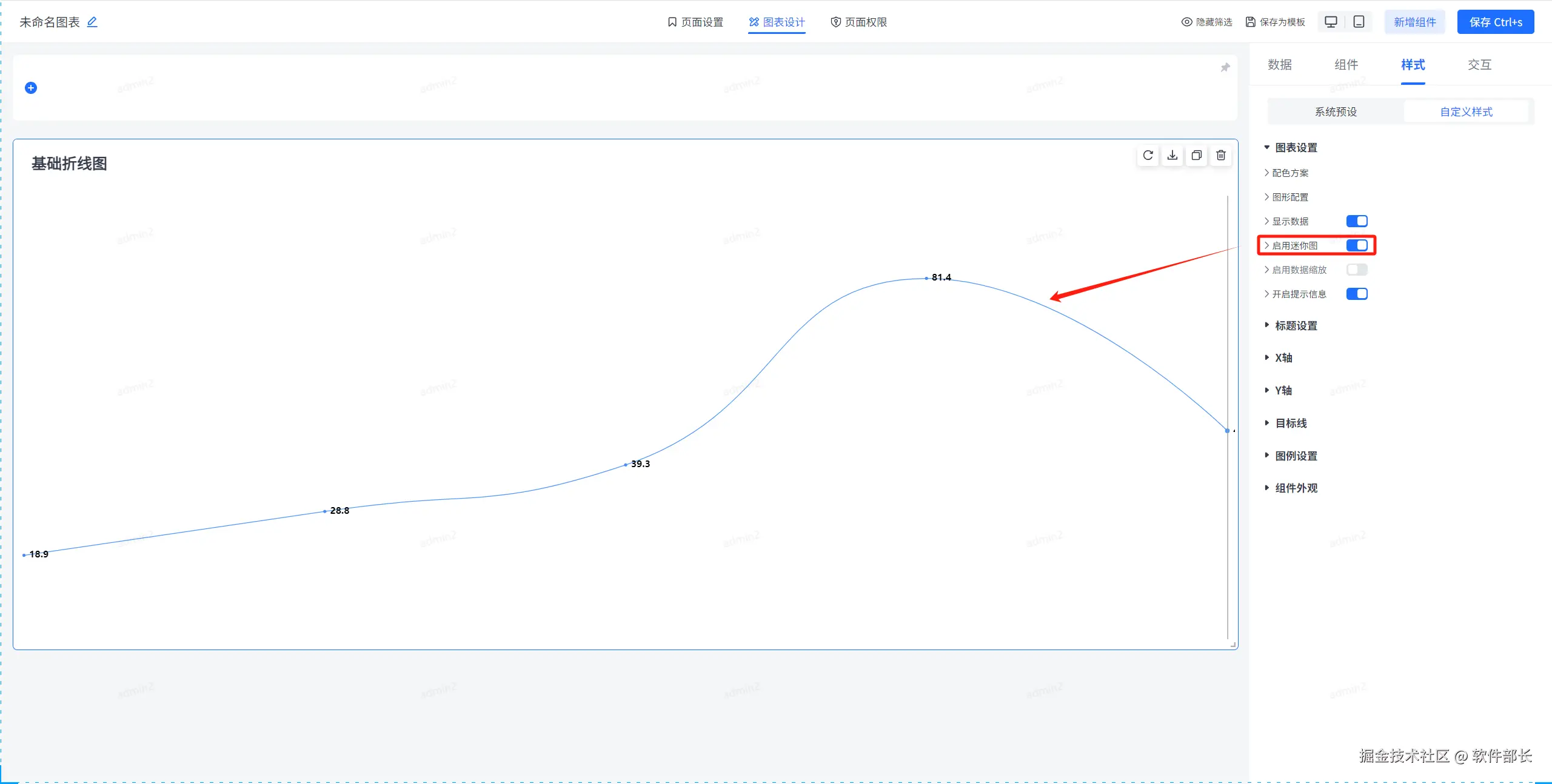 点击选择基础折线图,选择后点击【样式】下的【自定义样式】。就可以看到大致分为【图表设置】、【标题设置】、【X轴】、【Y轴】、【目标线】、【图例设置】、【组件外观】这几个大的模块。
