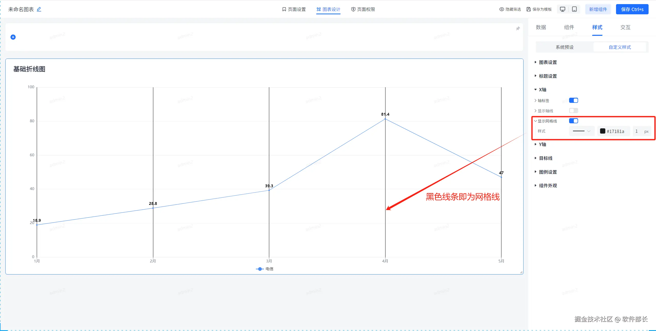 显示网格线即是x轴的网格线,勾选后可定义网格线的线条、粗细以及颜色。这里用显眼的黑色加以区分,以看到实际效果。