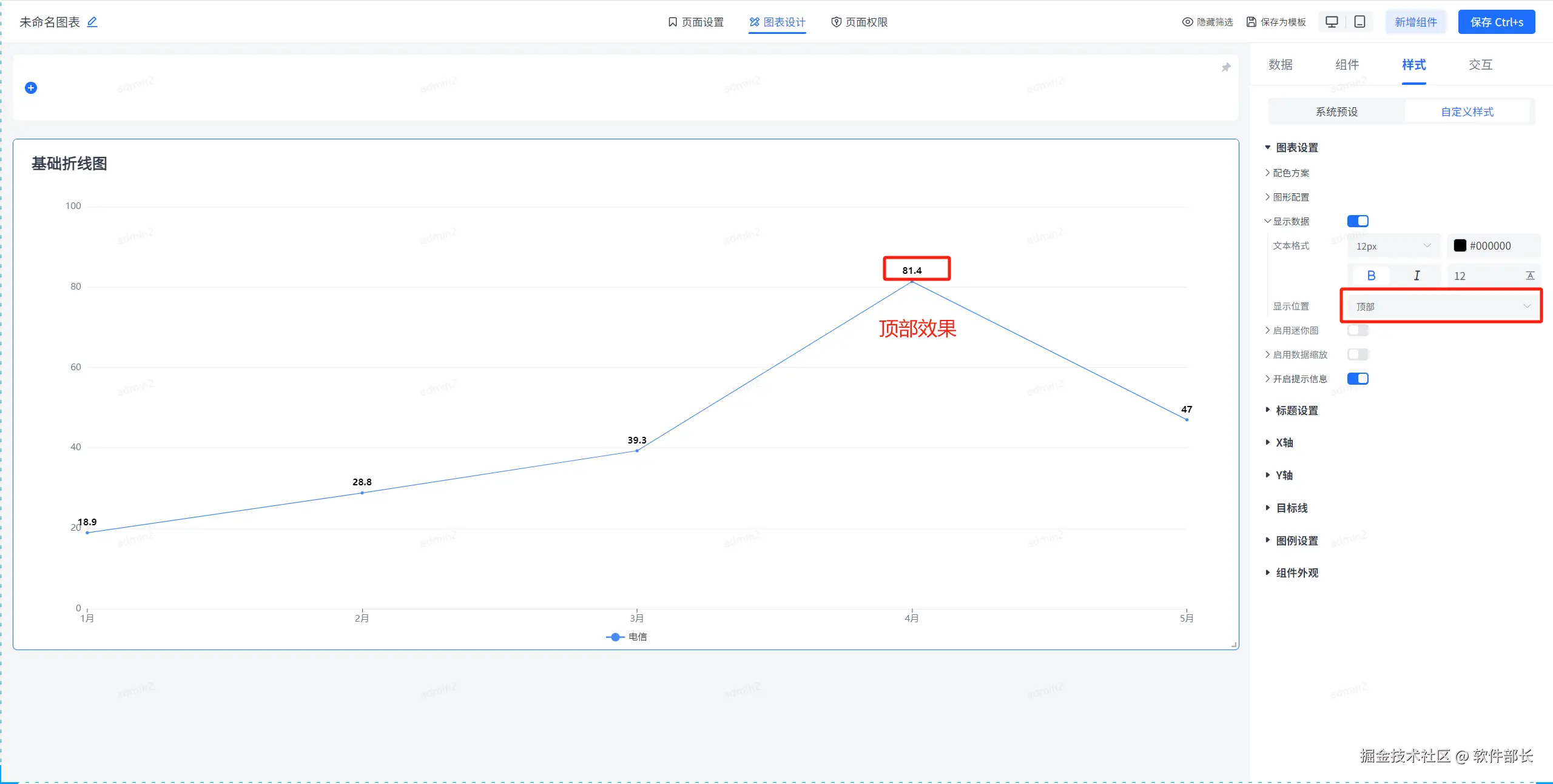 显示位置可定义显示数据是位于折线每个拐点的什么位置,可分为顶部、中心、左侧、右侧、底部五种。现在分别展示五种方式最后的效果。