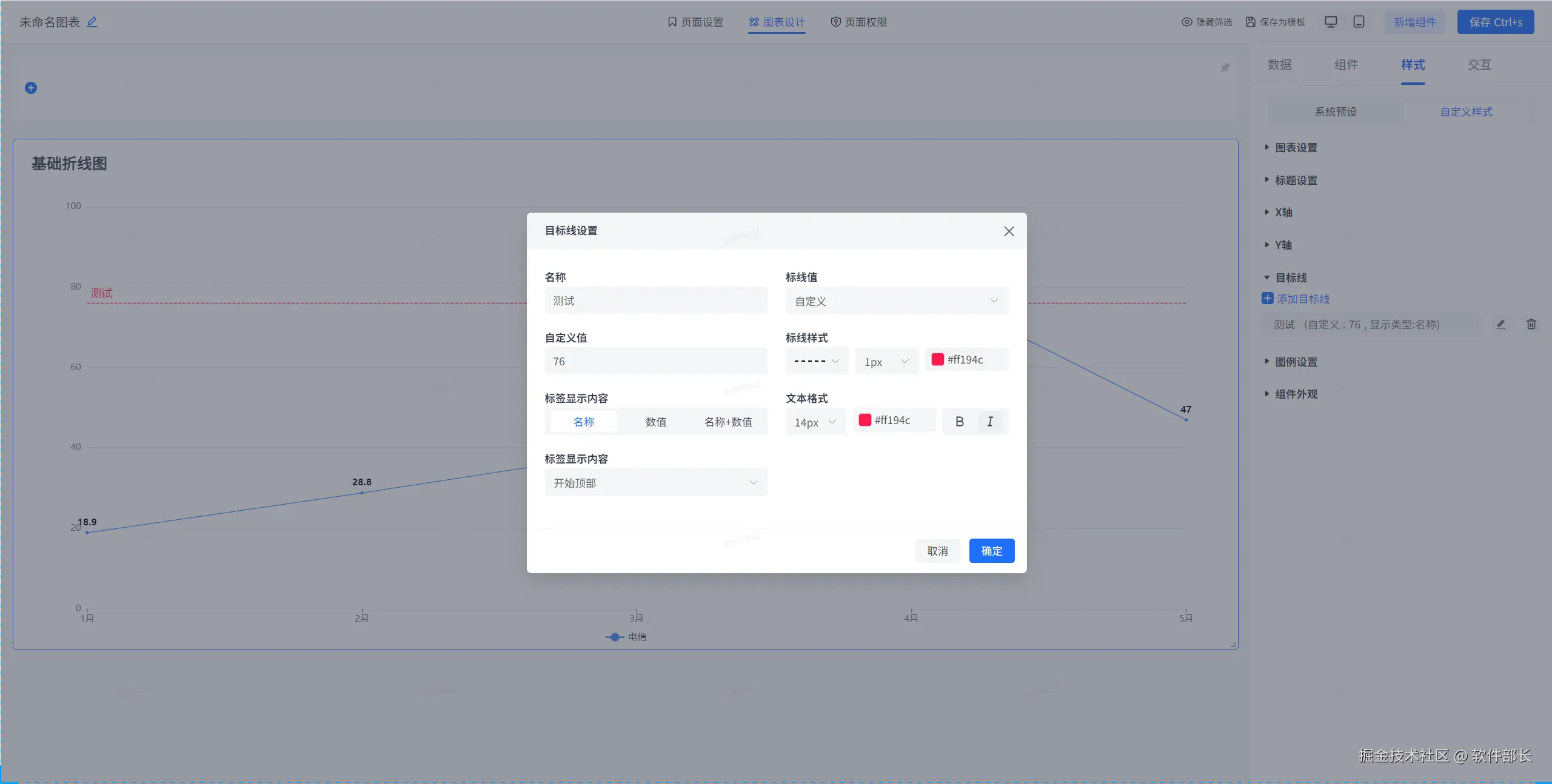 添加目标线,需给出目标线名称、定义目标线种类(可分为自定义、平均值、最大值、最小值)、目标线样式、颜色、大小。以及目标线显示内容是数值还是名称还是名称+数值,同时亦可设置文本标签的大小、样式和颜色。以及文本标签所处的位置是在线的开始顶部、底部、还是居中或末尾顶部或底部。