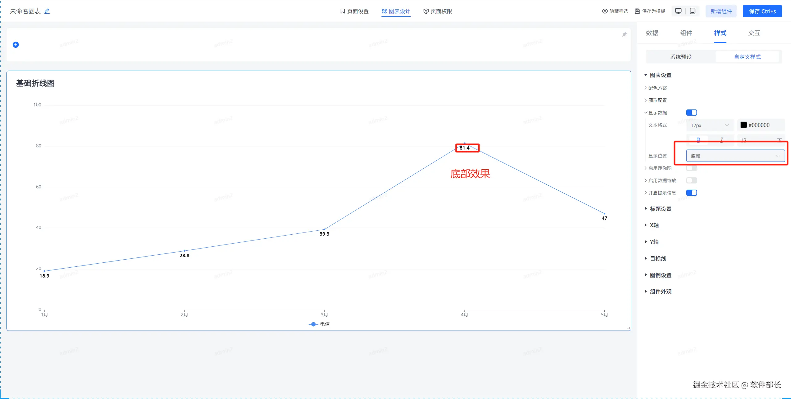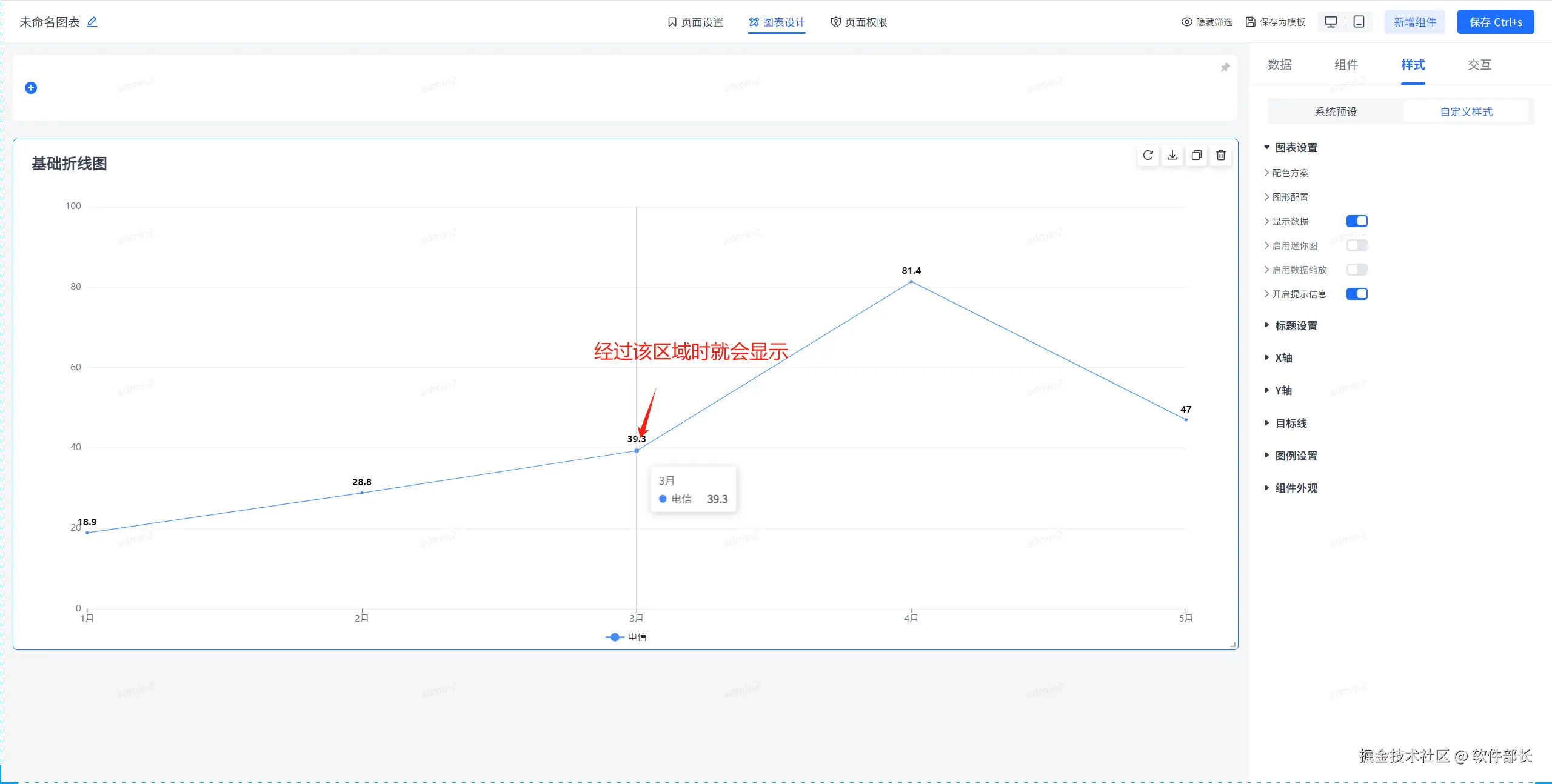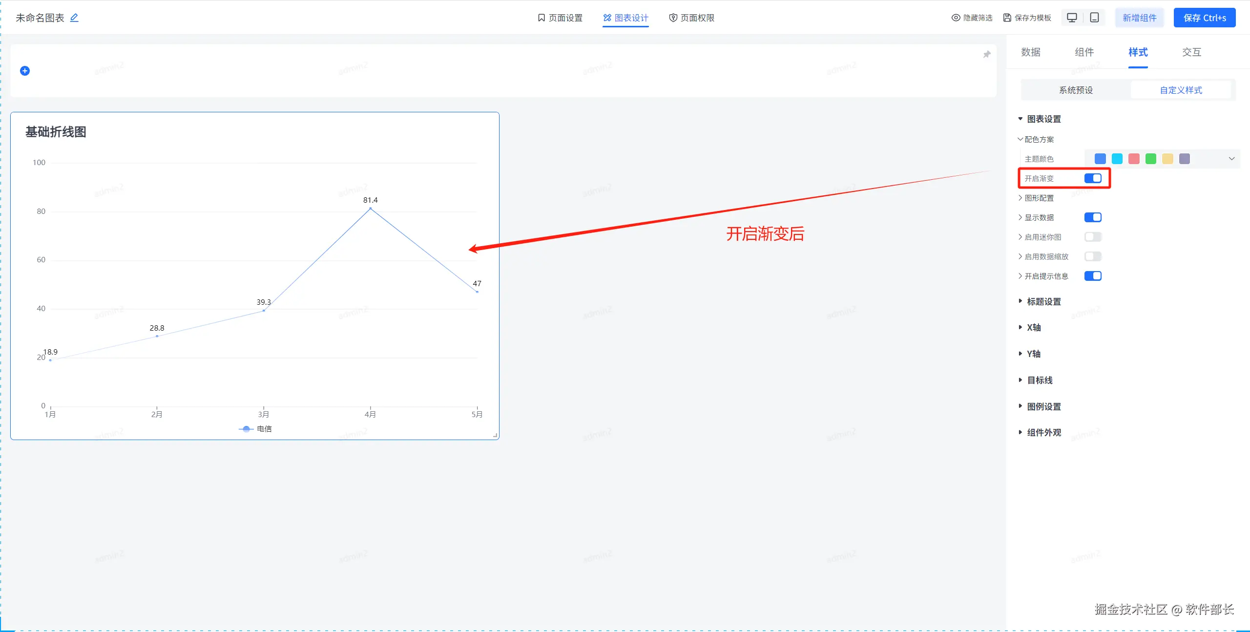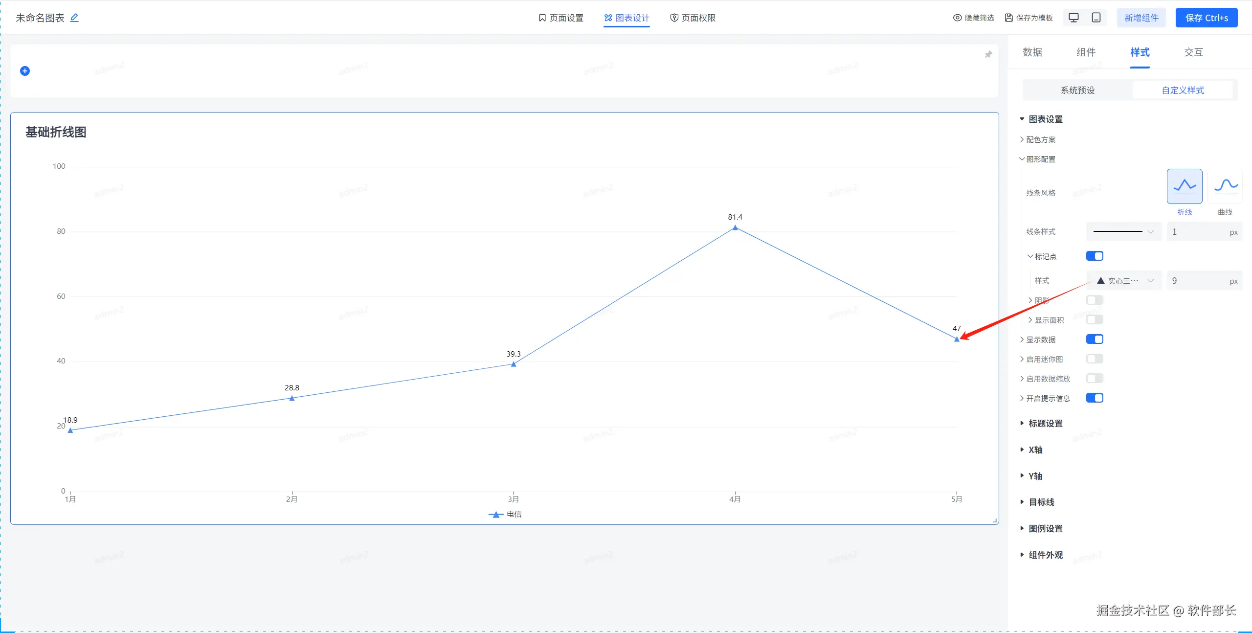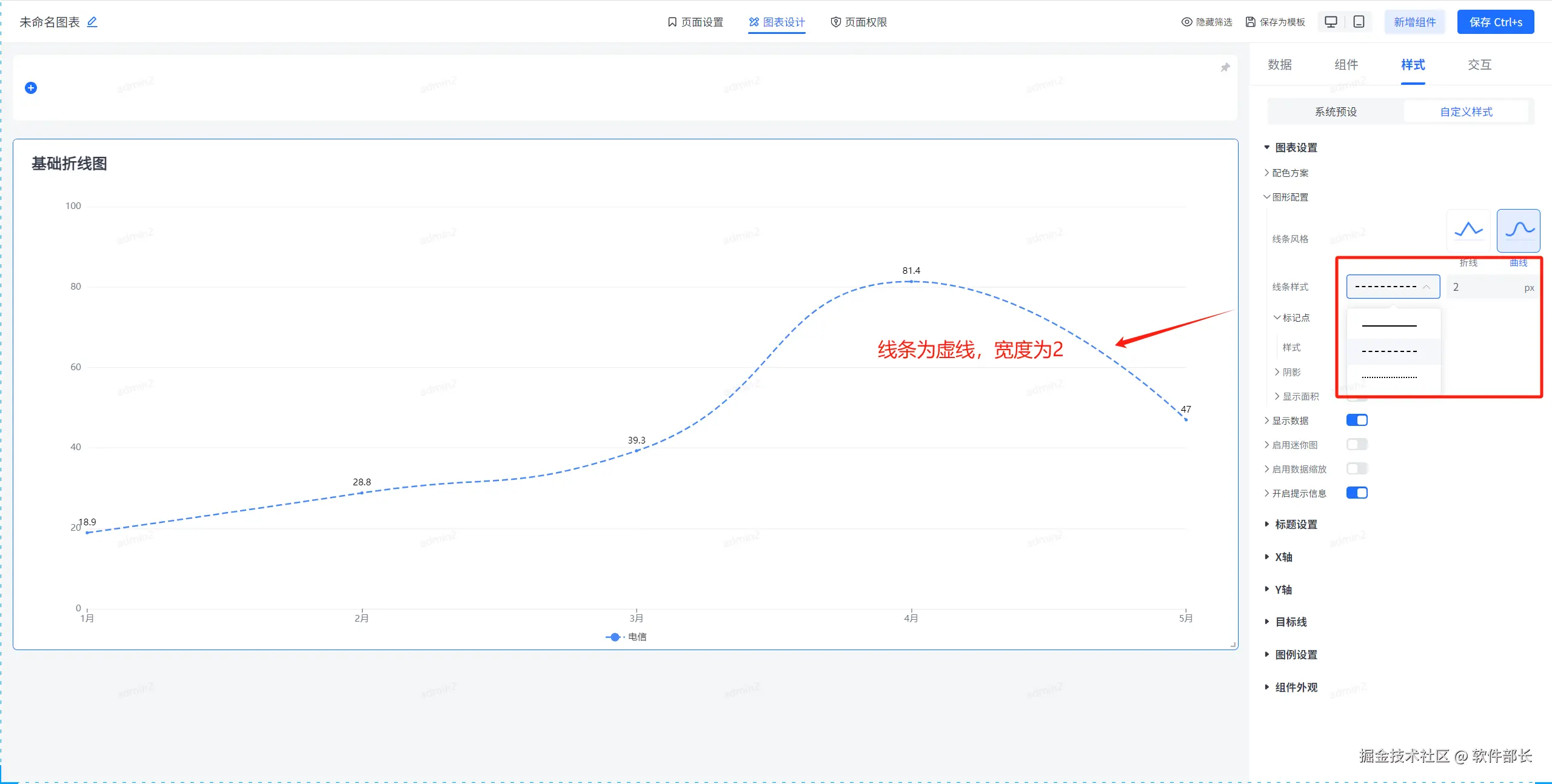 图形配置,主要是对折线图内部的相关配置。主要有折线线条风格、线条样式、线条宽度、标记点及其样式、阴影以及显示面积的样式设置。以下为具体配置方式。