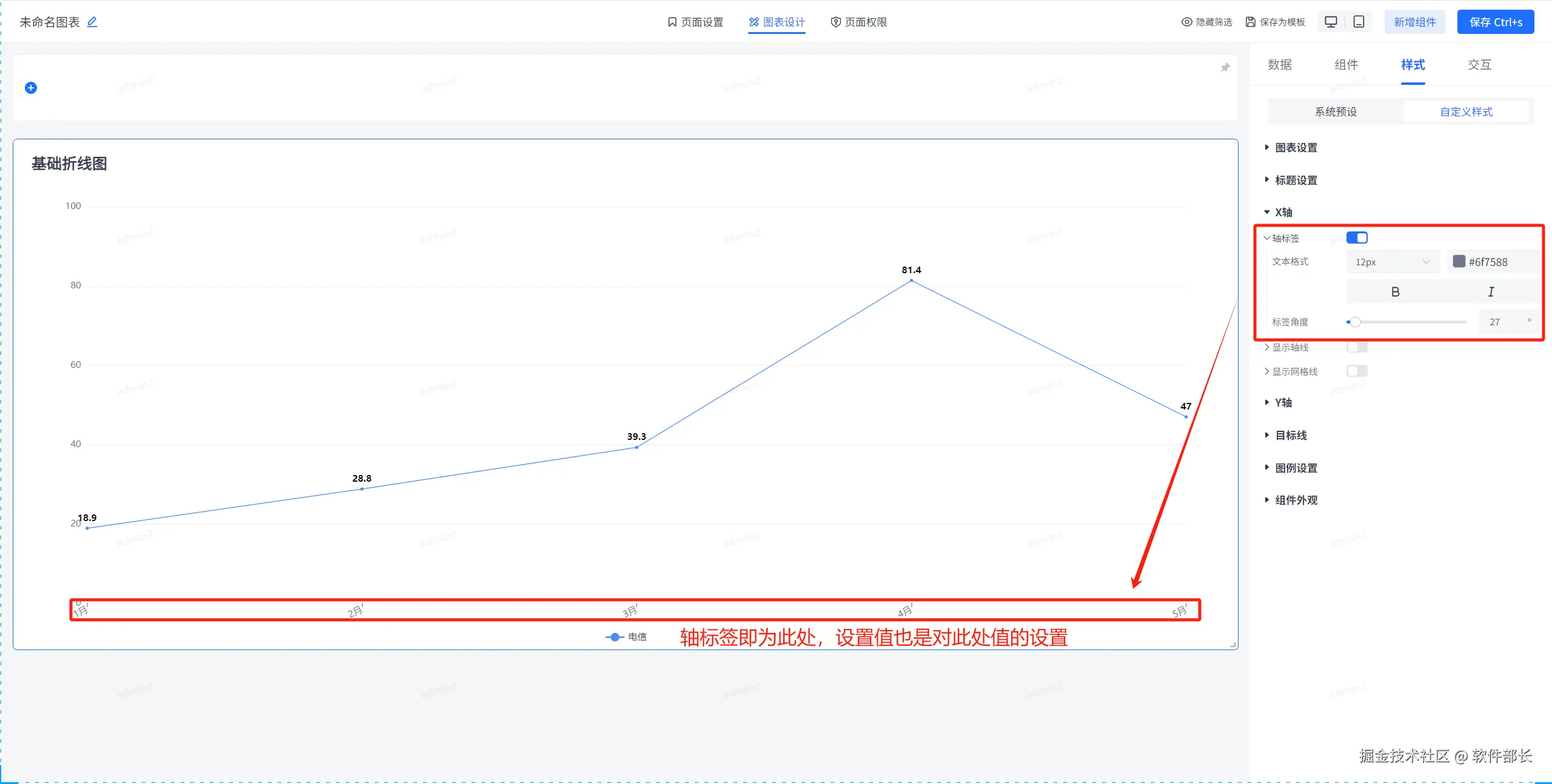 x轴和y轴设置是一样的,区别就是一个为横轴一个为纵轴。这里就描述一下x轴的样式相关配置,y轴进行类比即可。