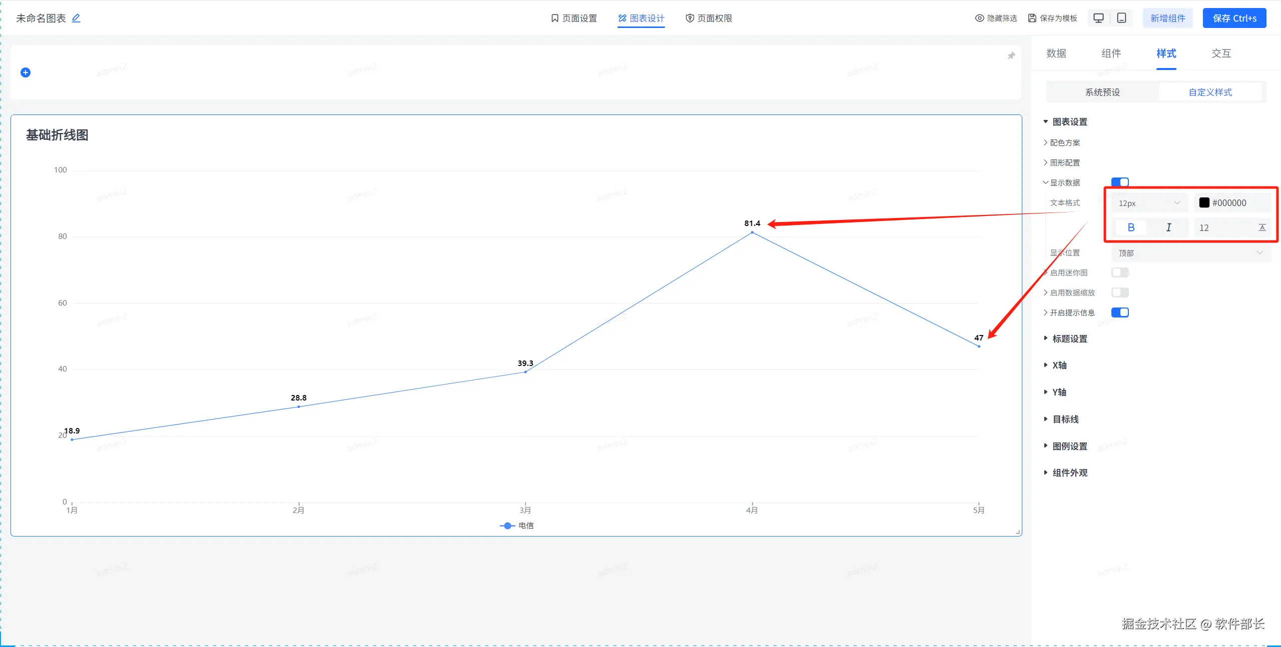 【显示数据】一般用于你数据集选择后,字段和维度的展示。打开显示数据后,可定义数据显示的文字大小颜色、粗细、斜体、上下边距。