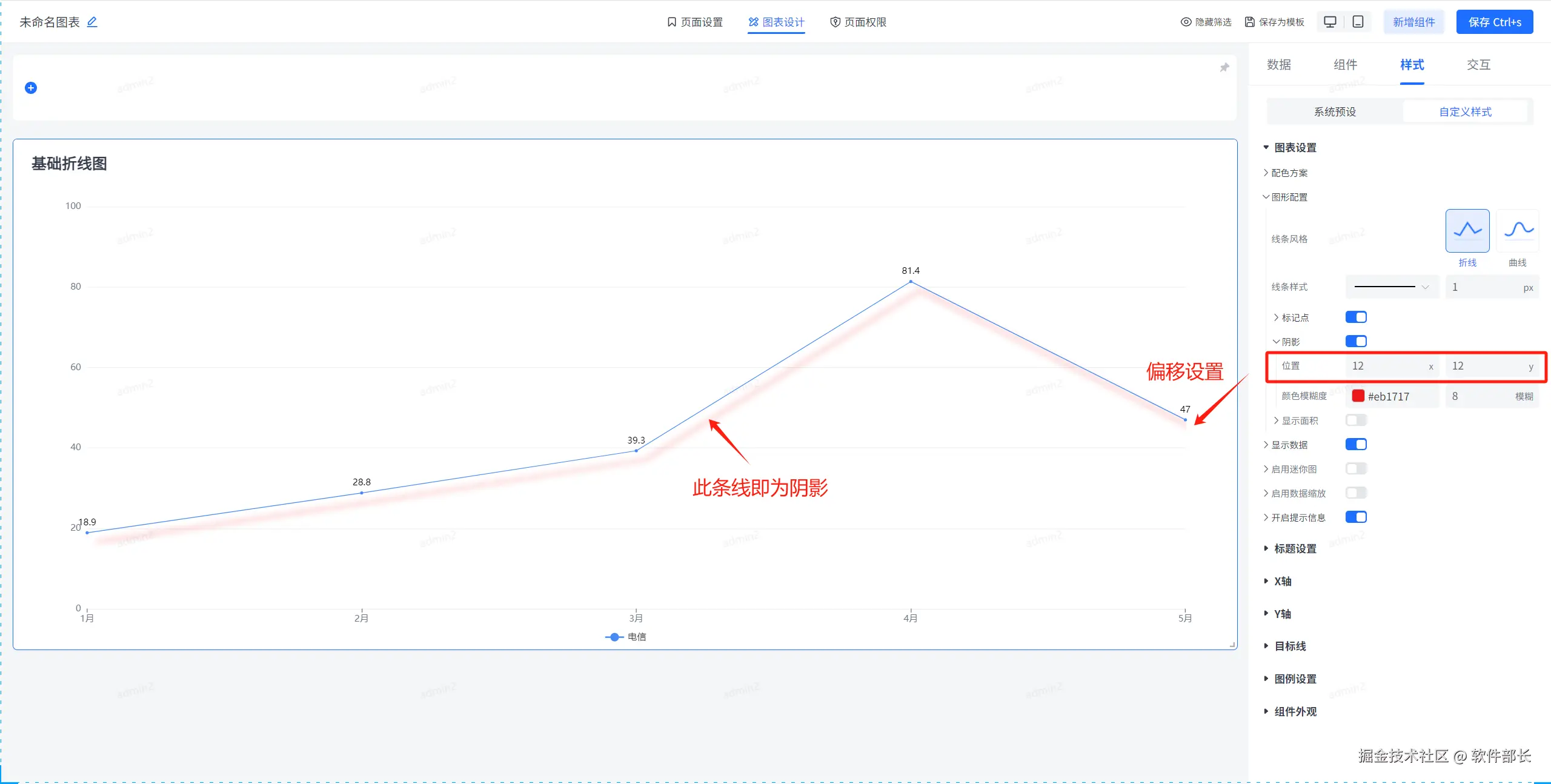 【阴影】即是该折线的阴影设置,可调节阴影的x、y轴的偏移量来实现阴影和原折线不重叠。模糊度越大即阴影显示越不明显。
