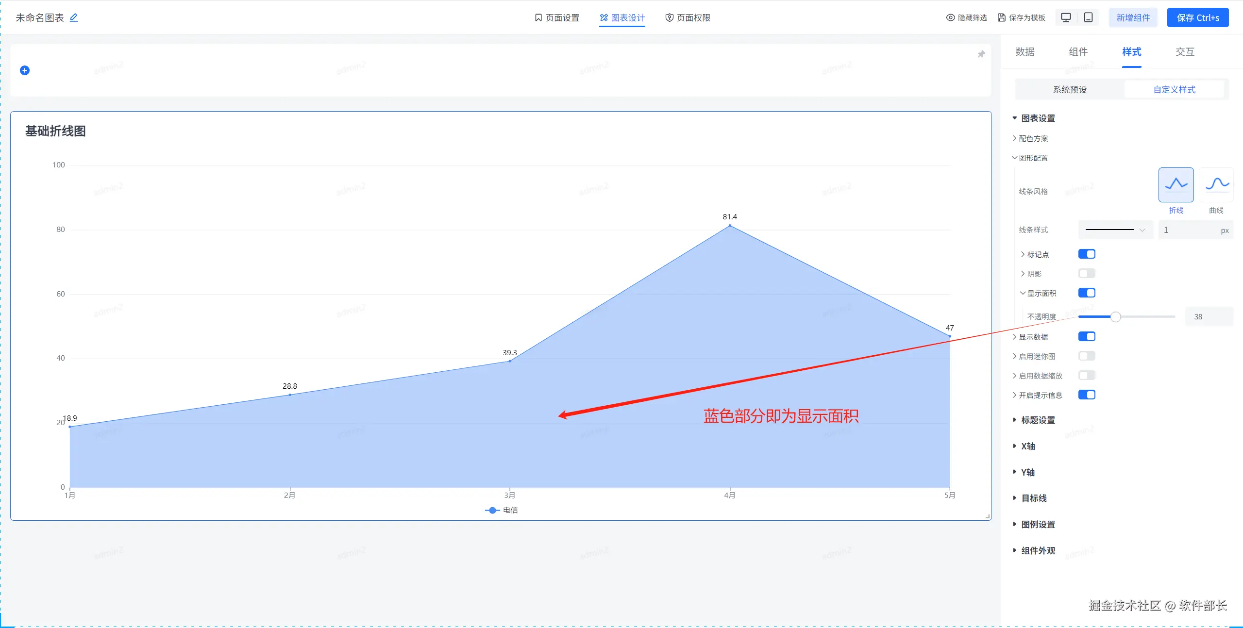 【显示面积】就是给折线图的下半部分进行填充处理,可定义填充背景颜色以及不透明度。