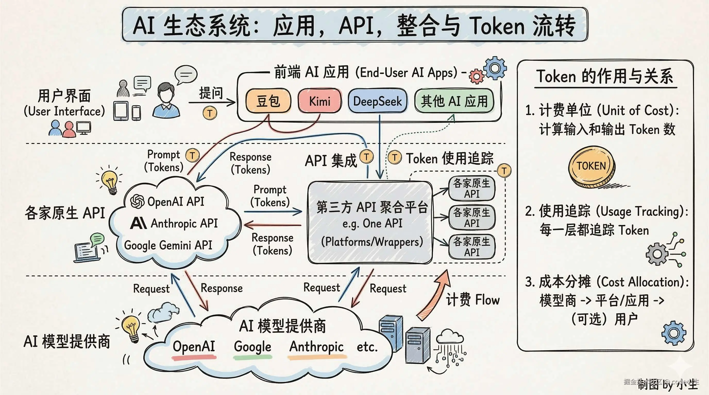 AI 模型的每一次 API 调用都会产生一个计费规则,而这个计费规则的单位就是 token。上图有流转示意。