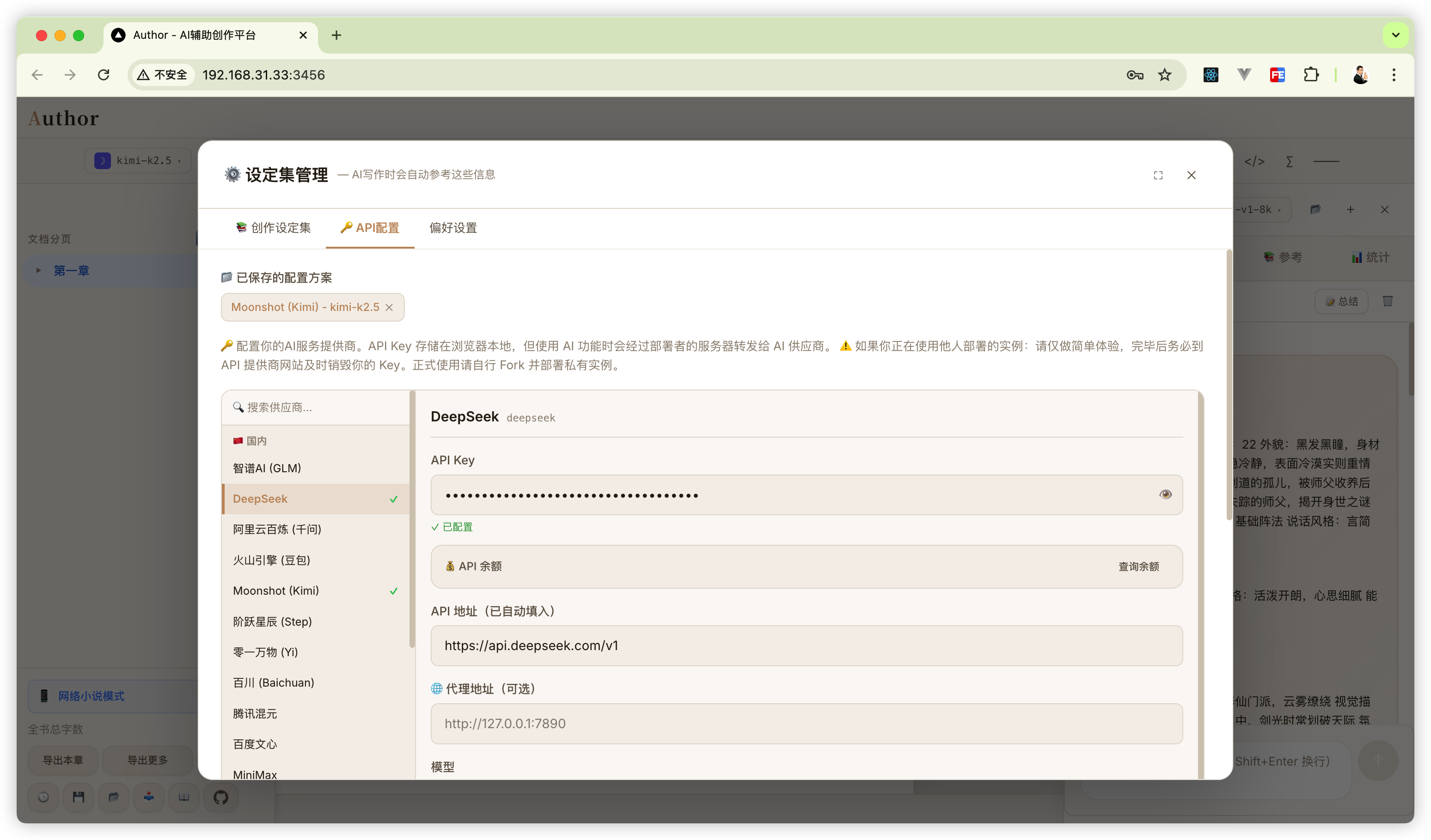 首次使用需要点击右下角的齿轮按钮,切换到「API配置」,给 Author 添加大模型。我用的是 kimi-k2.5,你根据自己需求配置即可。