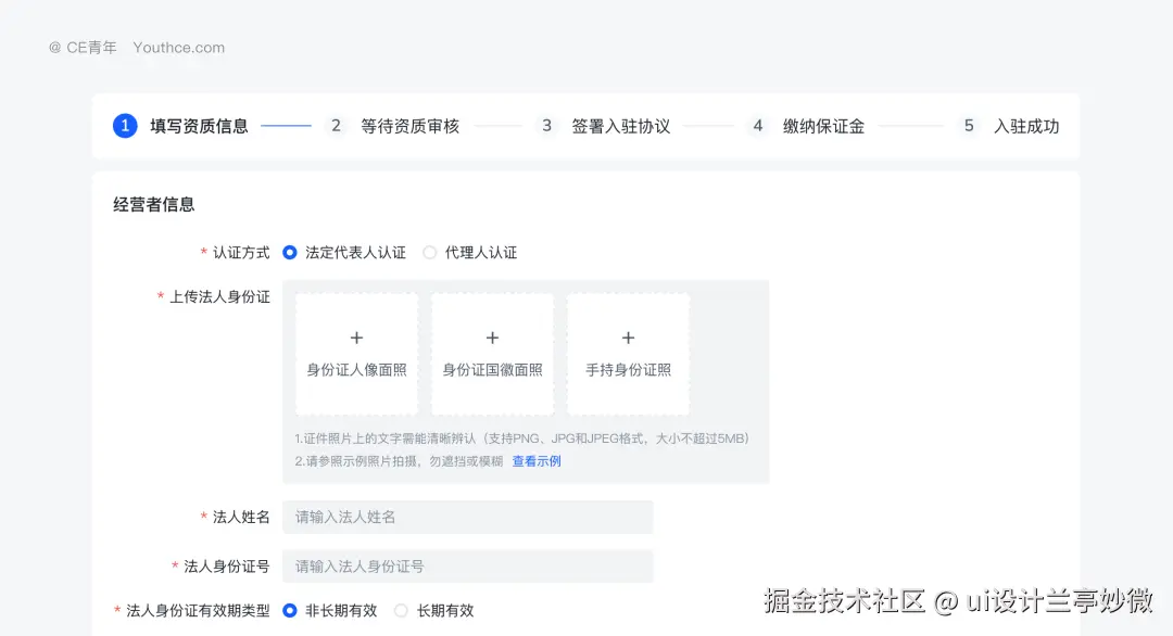 Q1:后续步骤的内容,是否与前一步内容会有依赖?是 → 使用步骤条。(比如:Step 1 选了“企业”,Step 2 才出现“营业执照”上传入口;选了“个人”,Step 2 则是“身份证”。前后有强逻辑耦合。)否 → 使用单页锚点。(比如:填写入职信息,基本信息和教育经历之间没有逻辑依赖,只是信息的类目不同。)