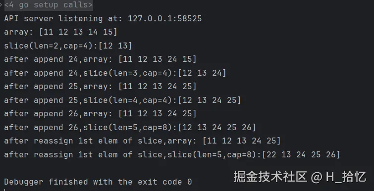 fmt.Printf("after reassign 1st elem of slice,slice(len=%d,cap=%d):%v\n", len(s), cap(s), s)