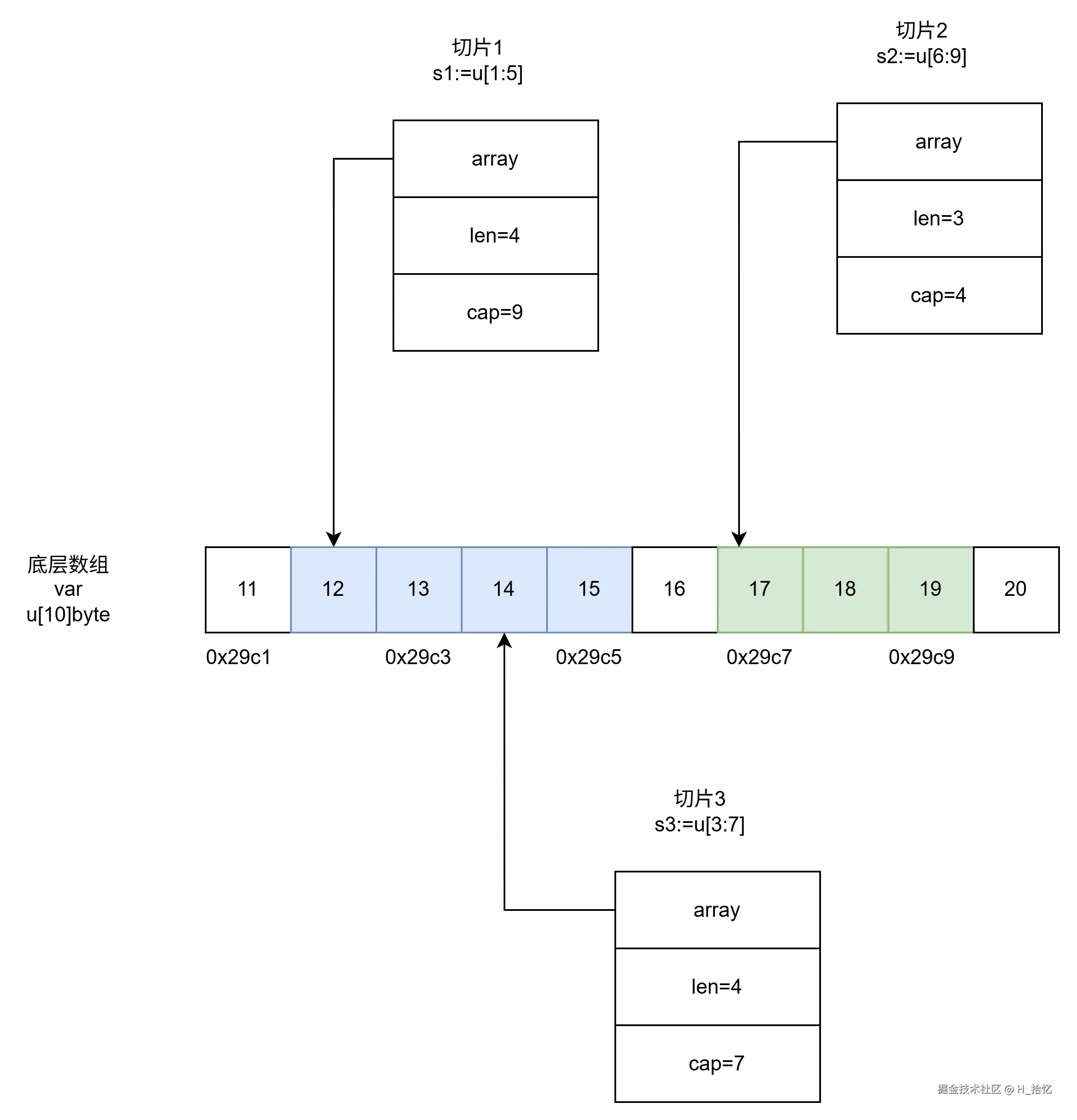 可以看到切片打开了一个操作数组u的窗口.通过s看到的第一个元素是u[3].通过s能看到并操作的数组元素个数为4个(high-low).切片的容量值(cap)取决于底层数组的长度.从切片s的第一个元素s[0].即u[3]到数组末尾一共有7个存储元素的槽位,因此切片s的cap为7.也可以为一个已存在数组建立多个操作数组的切片.