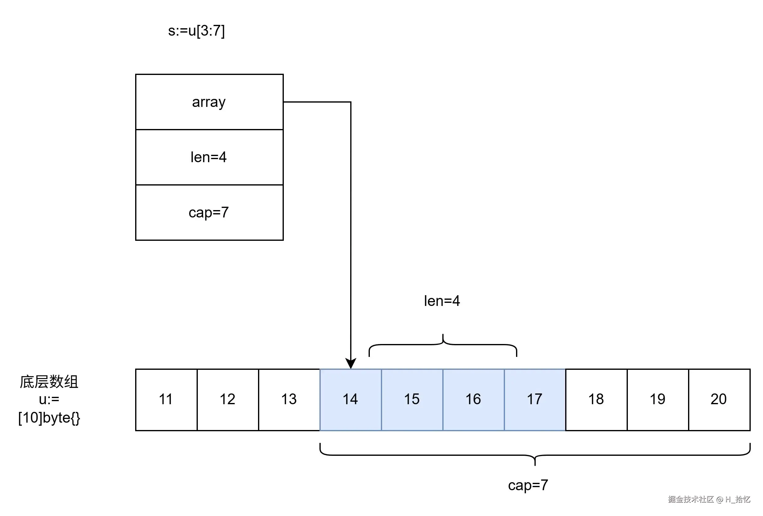 5).通过append操作向切片s再添加一个元素14.此时len(s)=3.cap(s)=4.append判断底层数组剩余空间满足添加新元素的要求.于是将14放在下一个元素的位置(数组u3末尾).并将s内部表示中的len加1变为4.