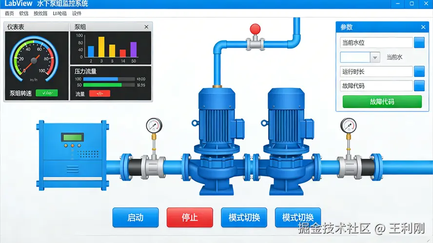 无隔水管泥浆回收循环钻井技术是深海钻探领域的关键技术,水下举升泵组作为该技术的动力核心,长期工作在深水复杂环境中,其运行状态的实时监测与远程控制直接影响钻探作业的安全性和效率。传统人工监测方式无法满足深海作业的远距离、高精度测控需求,因此需搭建一套基于工业通信协议的自动化监控系统,实现对水下泵组工作参数、设备状态的实时采集、显示与远程操控,同时保障系统在恶劣工况下的稳定性和扩展性。系统以 LabVIEW 为上位机开发核心,搭配 PLC 构建下位机测控单元,基于 Modbus RTU 协议实现上下位机的可靠通信,适配深海泵组的远程监控需求。
