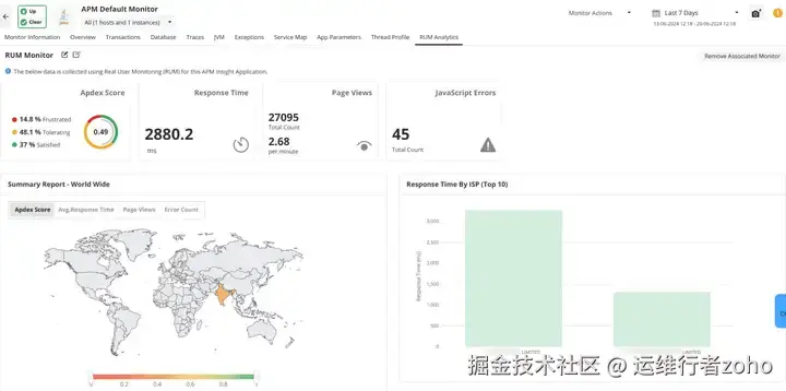还在为前后端性能监控割裂、排查问题找不到根源而头疼?Applications Manager中的 RUM(真实用户监控)分析仪表盘早已是众多开发者的实用利器,它将真实用户监控(RUM)与应用性能监控(APM Insight)深度整合,实现服务器端与客户端性能指标的统一视图,大幅简化应用监控与故障排查流程,帮你精准拿捏应用性能与用户体验。