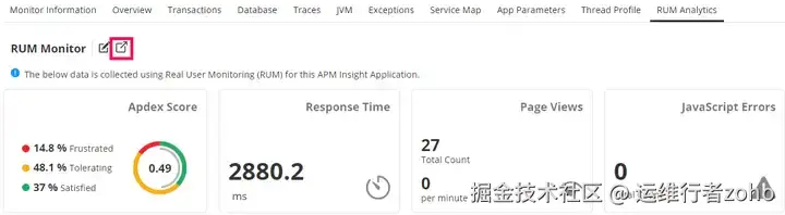 即刻用起来,升级应用监控体验! APM Insight与真实用户监控(RUM)的整合,早已是经过实践验证的高效监控方案,它让应用性能监控更清晰、管控更精准。借助 RUM分析仪表盘,你能更快解决各类问题,优化所有交互触点的性能,为用户提供无缝流畅的使用体验。现在就去 Applications Manager中启用该功能,让应用监控更高效、用户体验再上一个台阶!
