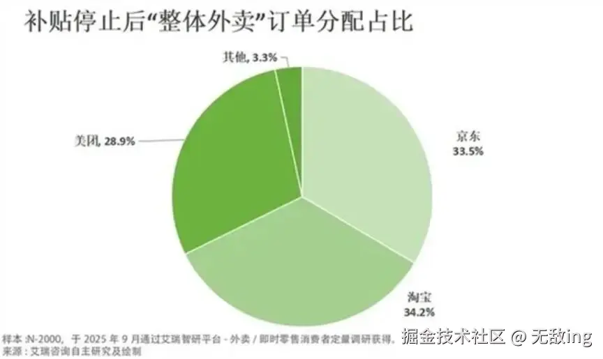 去年9月,艾瑞进一步发布报告《补贴退潮,外卖江湖“三分天下”成定局》。报告预测,在假设补贴完全停止的理性状态下,淘宝闪购/饿了么以34.2%的预期份额微弱领先,京东以33.5%紧随其后,美团则占28.9%。