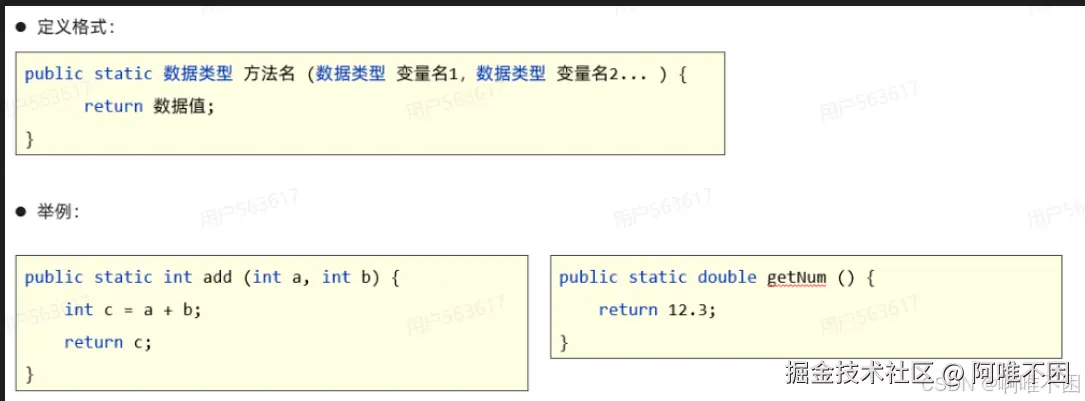 - 没有返回值的方法可以省略return语句不写,如果要编写return,后面不能跟具体的数据。