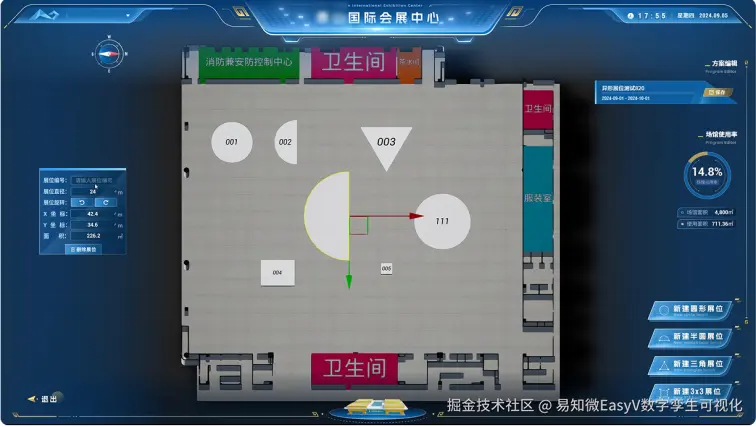 为补齐传统会展行业的管理信息化短板,易知微通过EasyModel数字空间底座生产平台实现泰山会展中心及其周边环境的数字化仿真,精准反映泰山会展中心的复杂地形与业务场景。聚焦空间管理、展位监控、人员培训、服务保障、应急处置五大领域,整合人流、设备、展位等多源业务数据,提升园区场馆的治理精准度,实现空间、业务一体化展示。推进现代信息技术与会展产业深度融合,显著提升运营效率与服务质量,推动会展活动的智能化、网络化和高效化发展。提升有限资源利用率,激发区域发展的活力和动力,提升泰山会展中心的整体服务水平。