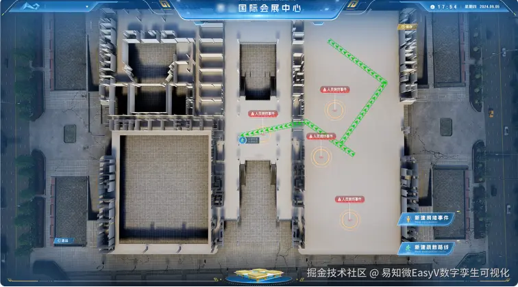 支持在场馆模型中进行应急事件演练,预设起火点、疏散路线等动态波动数据,实时展示人流密度、设备状态等数据,有助于支撑模拟演练的安防需求,辅助建设完备的应急疏散方案,提高突发事件的响应速度,增强安全防控与应急响应的能力,确保相关人员在突发应急事件中能够迅速响应。