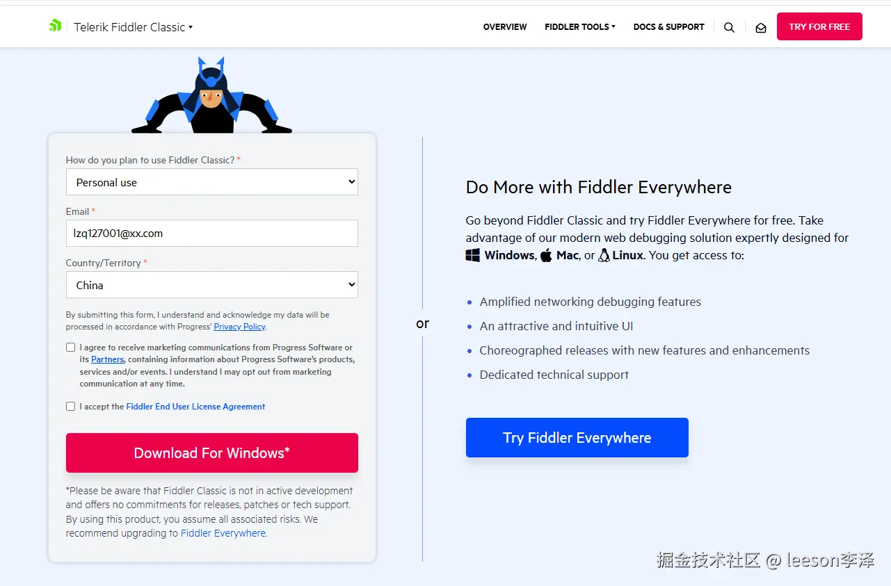 下载左边的 Fiddler 普通版,选择个人使用,输入信息下载即可。右边是功能更强大的一个版本,但是只有 30 天试用期。
