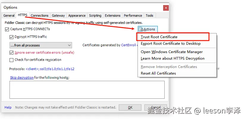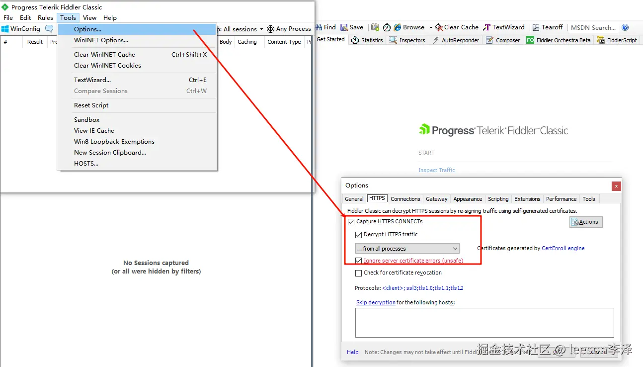 点击【工具】-【选项】,勾选上 https 相关功能,勾选之后会自动生成一个 fiddler 的 ssl 证书,同时弹窗对证书进行确认: