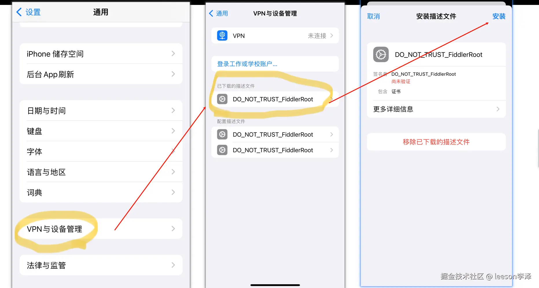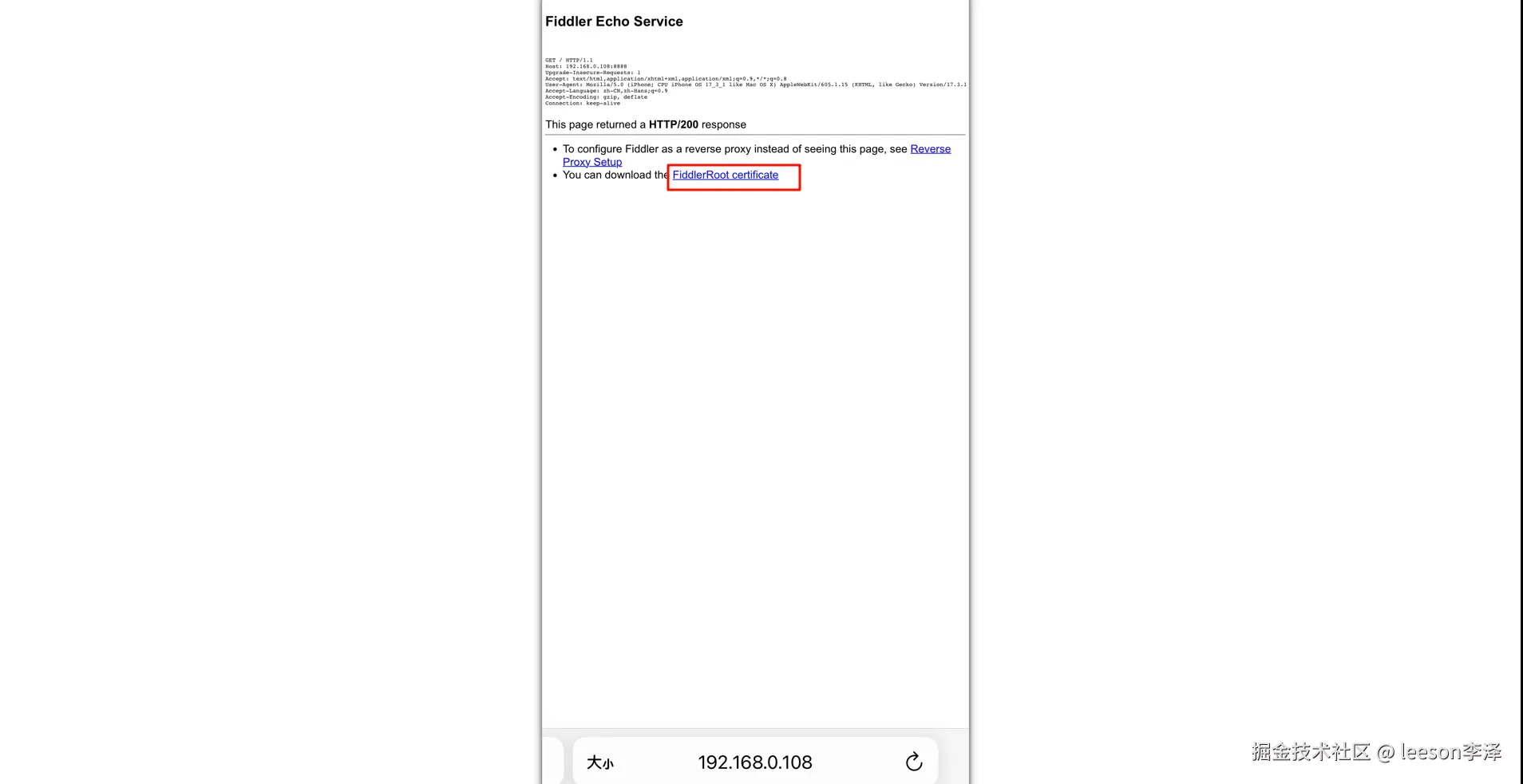 重启 fiddler 后,手机连接到和电脑同一个 wifi 下面,手机访问电脑 ip + 端口,进入 fiddler 代理服务器的页面,能访问说明正确启动了 fiddler 代理服务器,点击 FiddlerRoot certficate 下载 ssl 证书,然后在手机设置里面安装和信任该证书: