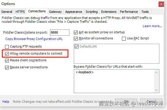 选中 Connections,设置本地 fiddler 代理服务的端口号和允许远程连接,即允许别的设备把 HTTP/HTTPS 请求发送到本地机器上。(设置此设置后需要重启)