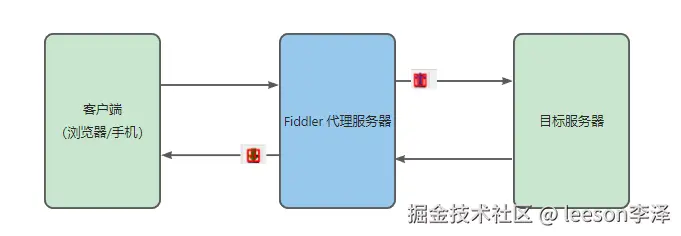 Fiddler 本质是一个 HTTP/HTTPS 代理服务器,工作在应用层,Fiddler 如同一个“数据中转站”,拦截并记录所有经过的流量,数据流向: