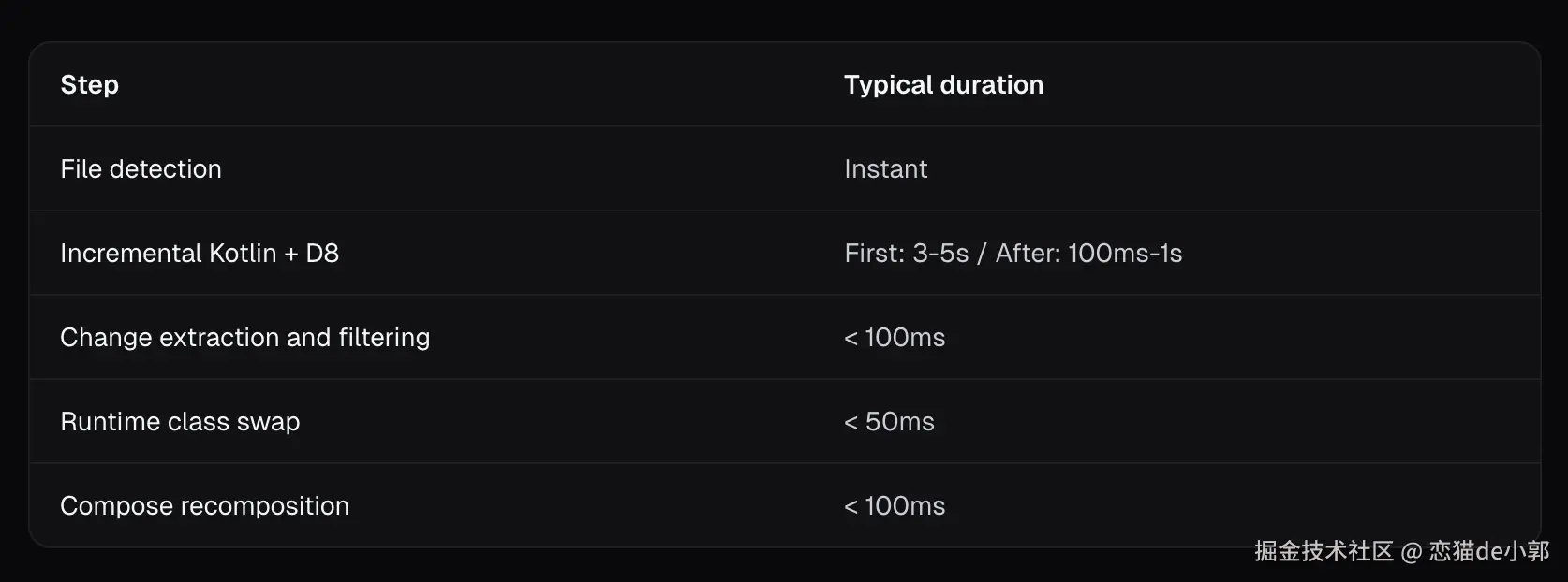 当然,由于 Android ART 对类重定义有严格限制(不允许在运行时更改类的结构、内存布局或方法签名),按 ART 的常规限制,运行时类重定义通常不允许修改类结构,但 HotSwan 通过额外的编译器与运行时处理,对部分结构性变化做了扩展支持,比如同文件新增函数、Data Class 新增属性等,不过这类能力并不是无限制的,而且在 API 30+ 上体验更完整,API 28/29 更容易回退到完整构建 ,其他如: