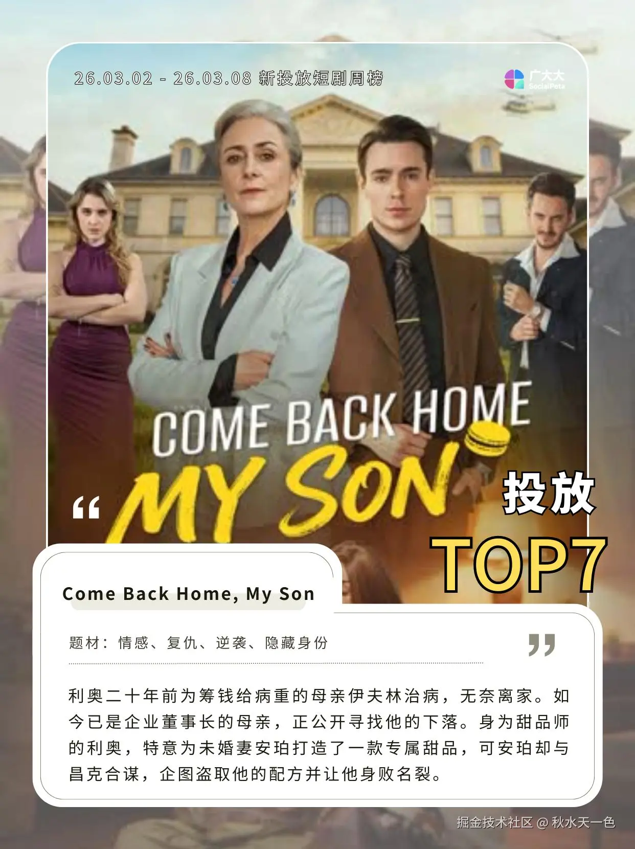 本周周榜排名第七的短剧为《Come Back Home, My Son》,主要讲述的是CEO老妈20年间不断寻子的故事。该剧周期内投放量去重后约2.05K,展现估值约1405W,目前主投平台为【DramaBox】【Kalos TV】和【Minishorts】。