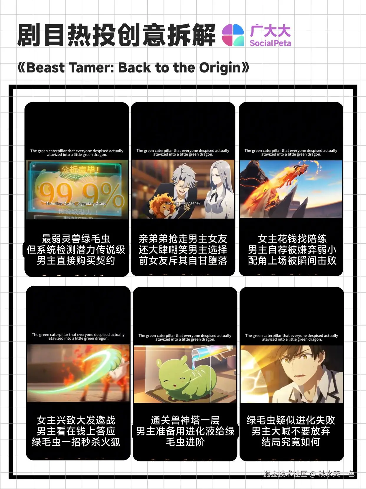 如此巧思的设定,在该剧中当然就要好好利用了。开局就打造了极致反差,3秒抓住用户眼球——用人人唾弃的最弱灵兽和天花板级传说潜力的强对比,立住整部剧的核心爽点,同时抛出悬念:毛毛虫到底能进化成什么;中间则用几个经典桥段为后面的逆袭铺路:亲弟弟和女友合伙绿了自己,自荐陪练但被嫌弱之后啪啪打脸,直接给用户即时爽感;最后则展示男主和灵兽的成长剧情,用进化疑似失败吊足观众胃口,在马上揭晓的瞬间结束,把剧情卡在最紧张、最有悬念的节点,直接拉高转化率。