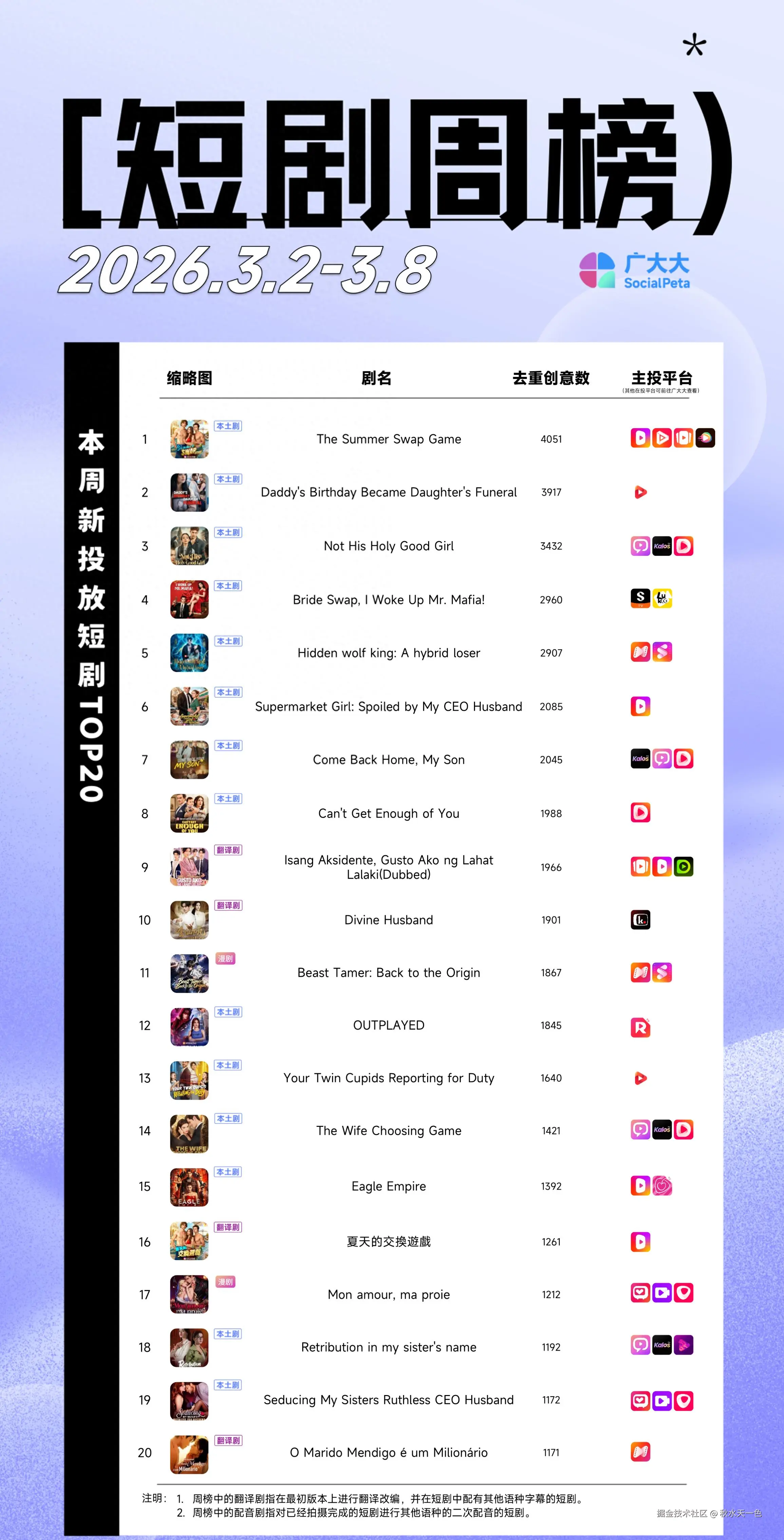 广大大发布26.03.02 - 26.03.08 海外热门新投短剧周榜: