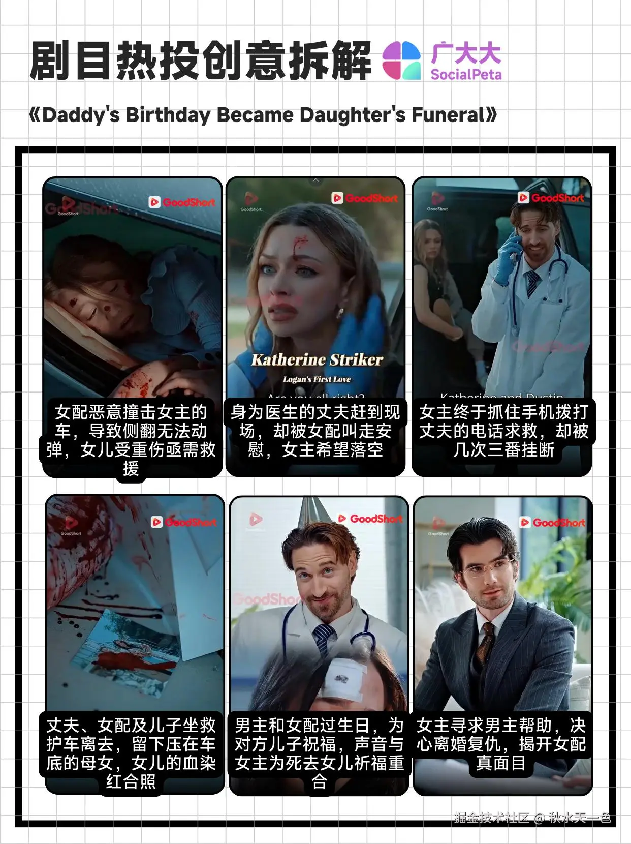 该剧的投放素材十分经典,医生丈夫见死不救、女儿惨死、初恋插足的戏码很是眼熟。从这部剧也可以看出其背后成熟的制作公式:背叛→重创→复仇,完美的强冲突闭环。在本剧中,女主被恶毒女配撞车之后,赶到现场的丈夫看到一边是压在车底、浑身是血的妻子和女儿,一边是伤势轻微的初恋和其儿子,毫不犹豫地选择了初恋,而女主几次求救电话都被丈夫挂断,最后甚至连赶往现场的救护车都被初恋儿子抢占,导致女儿死亡。
