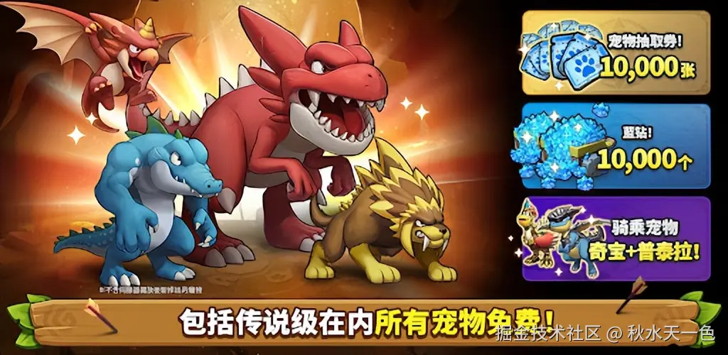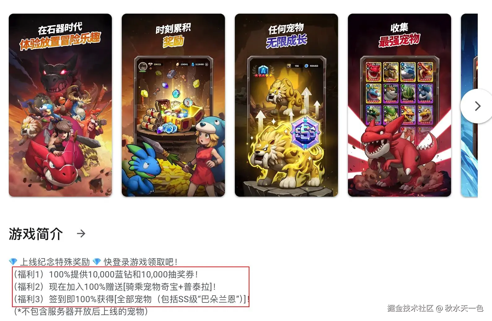 营销方面,【StoneAge:Idle Adventure】主打卖IP情怀牌和放置减负玩法,idle一词也频繁出现在买量文案中。或者说除了有“特殊癖好”的日本玩家外,减负、停肝、单人可玩的玩法简化早已成为全球玩家的一致取向。减负之余,【StoneAge:Idle Adventure】也将福利拉满,打出了免费10000抽、10000钻、宠物登录免费送的夸张宣传语。