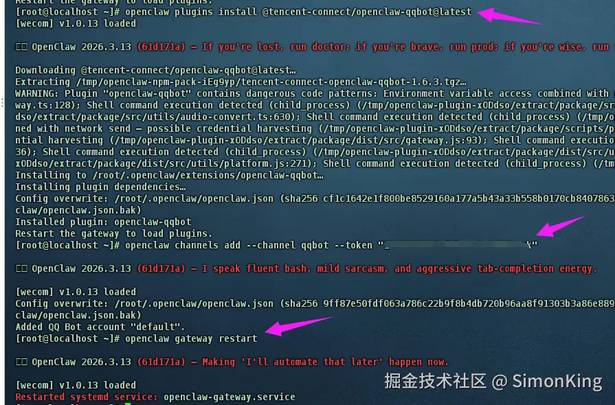 放入虾塘也就是将机器人接入OpenClaw,官方给了三个步骤,直接复制、黏贴执行即可。