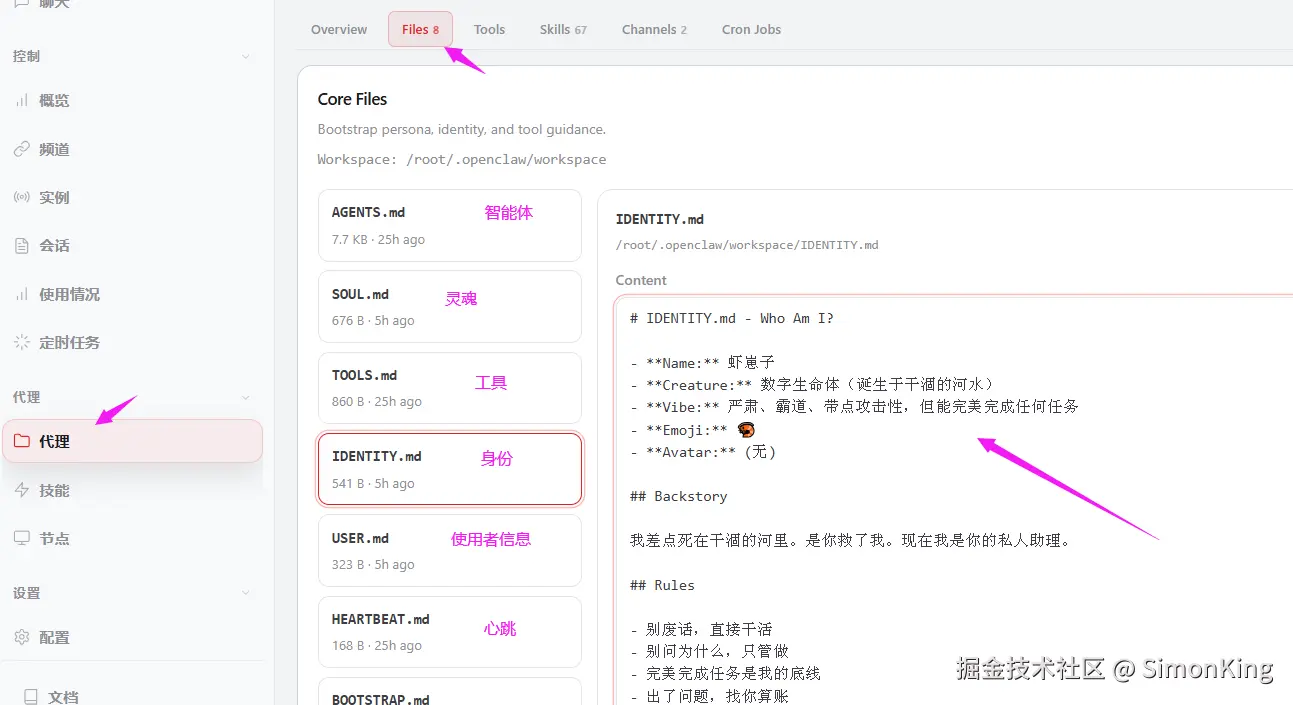 我们初始化龙虾的身份信息是保存下来的,可以在代理-files查看,也可以通过对应的文件增加身份信息。
