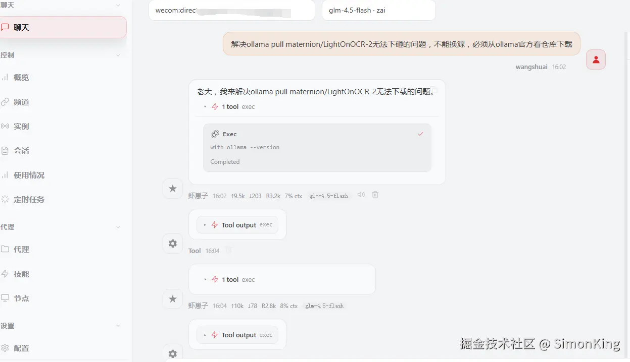 比如我让我的虾崽子解决ollama的拉取模型的失败的问题,我们可以看到小龙虾的思考过程以及调用工具。