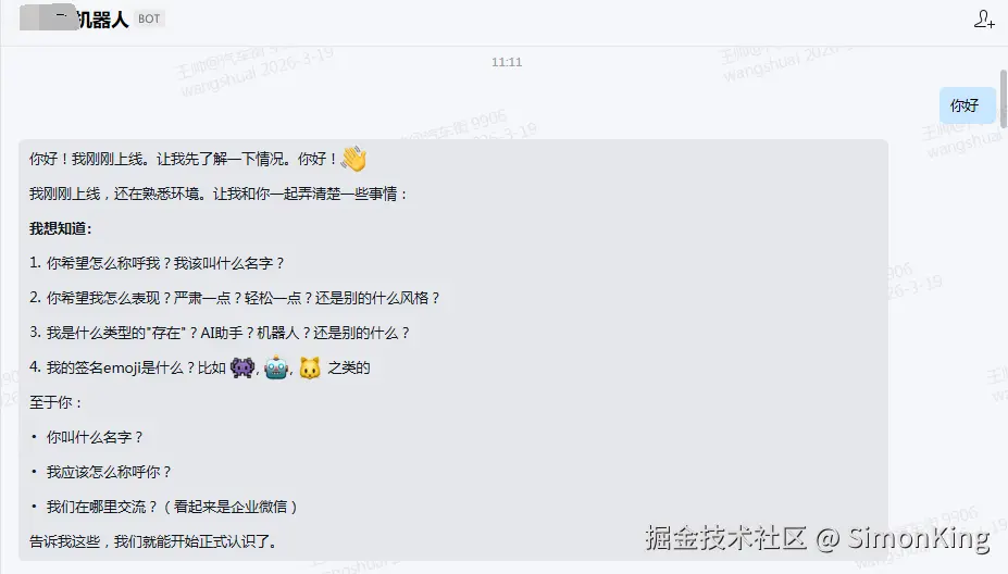 设置每个小龙虾的设置方式一样,我们以企业微信为例。打完招呼之后,他会提示你要做哪些设置。