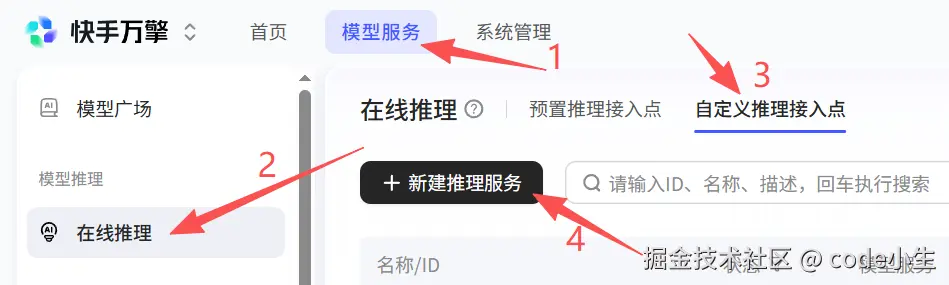 在“streamlake”界面中点击“模型服务” ,在左侧菜单中,选择“在线推理”,在“自定义推理接入点”页签下选择“新建推理服务”