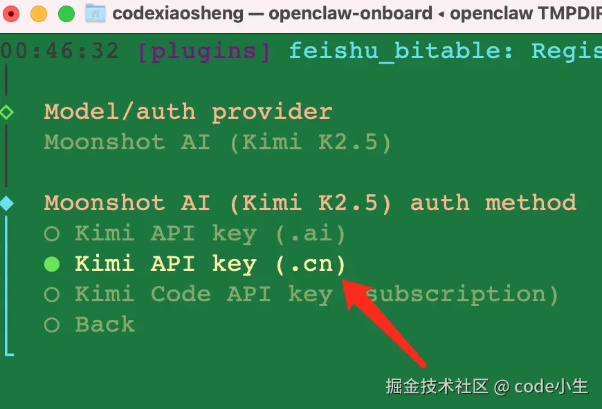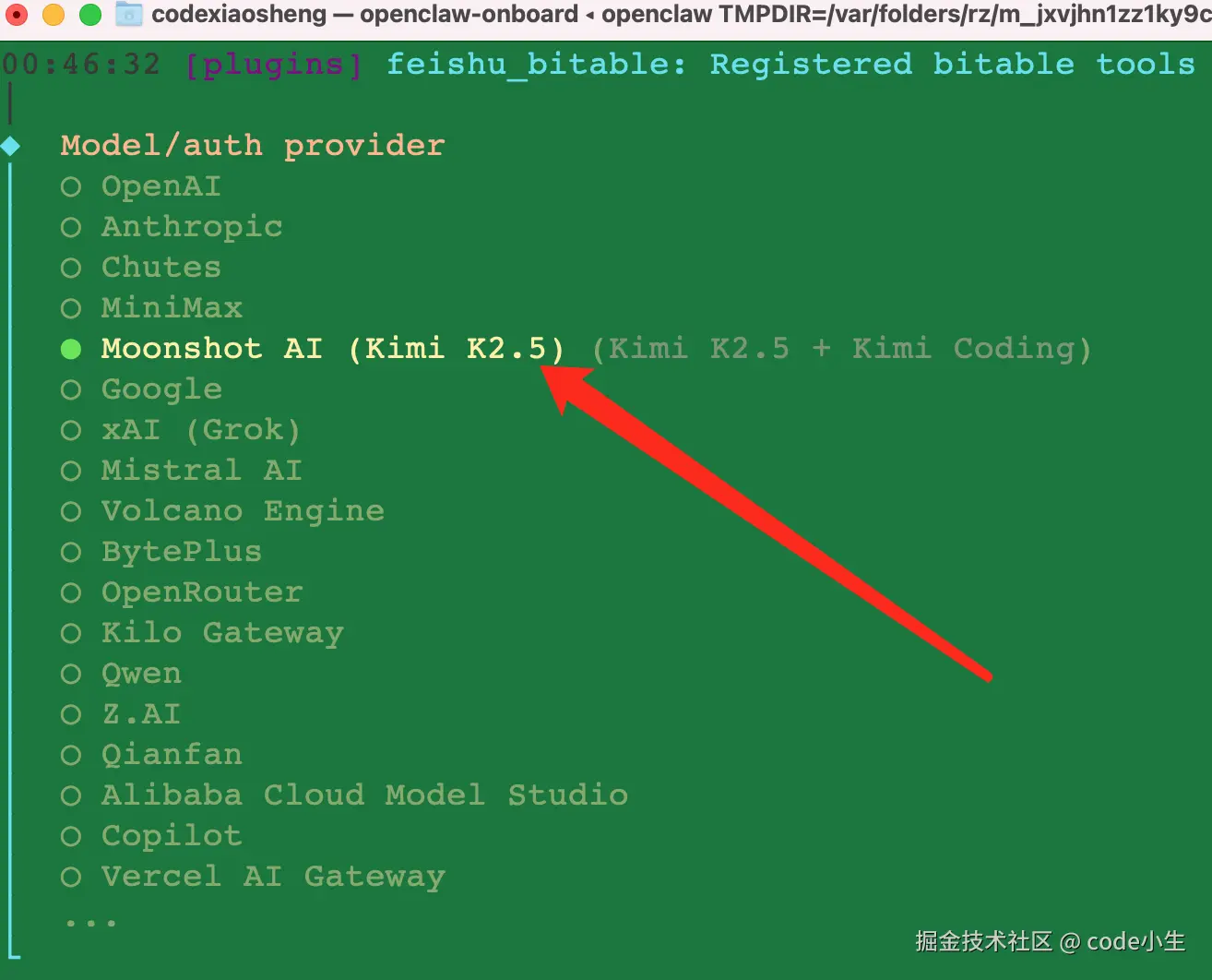 4.2 模型选择 Moonshot AI(Kimi K2.5) ,回车