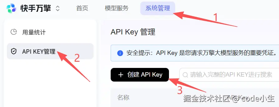 在“streamlake”顶部菜单中选择 系统管理-API KEY管理-创建 API Key,信息自定义就行,复制一下key保存好,别暴露,以后常用的话会一直用到。