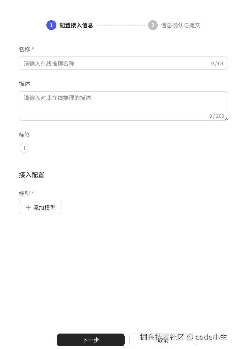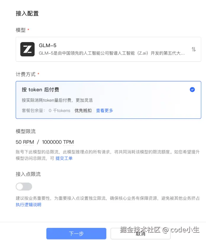 如果不需要调整模型限流(意思就是限制请求的频率),点击“下一步”,确认一下,没有问题就点“提交”。