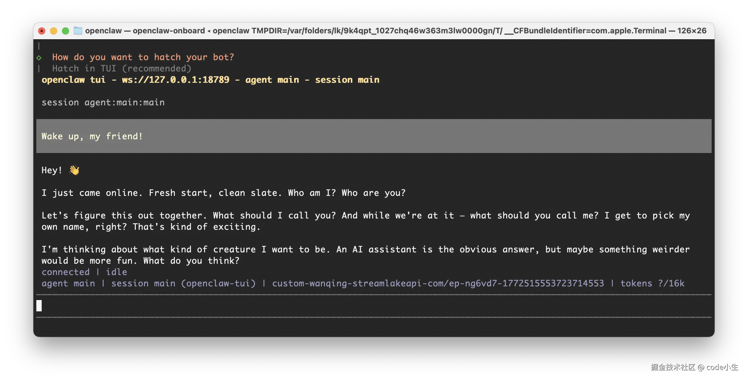 上一步回车会看到如下图,大功告成,这样你的小龙虾就可以和你对话了。