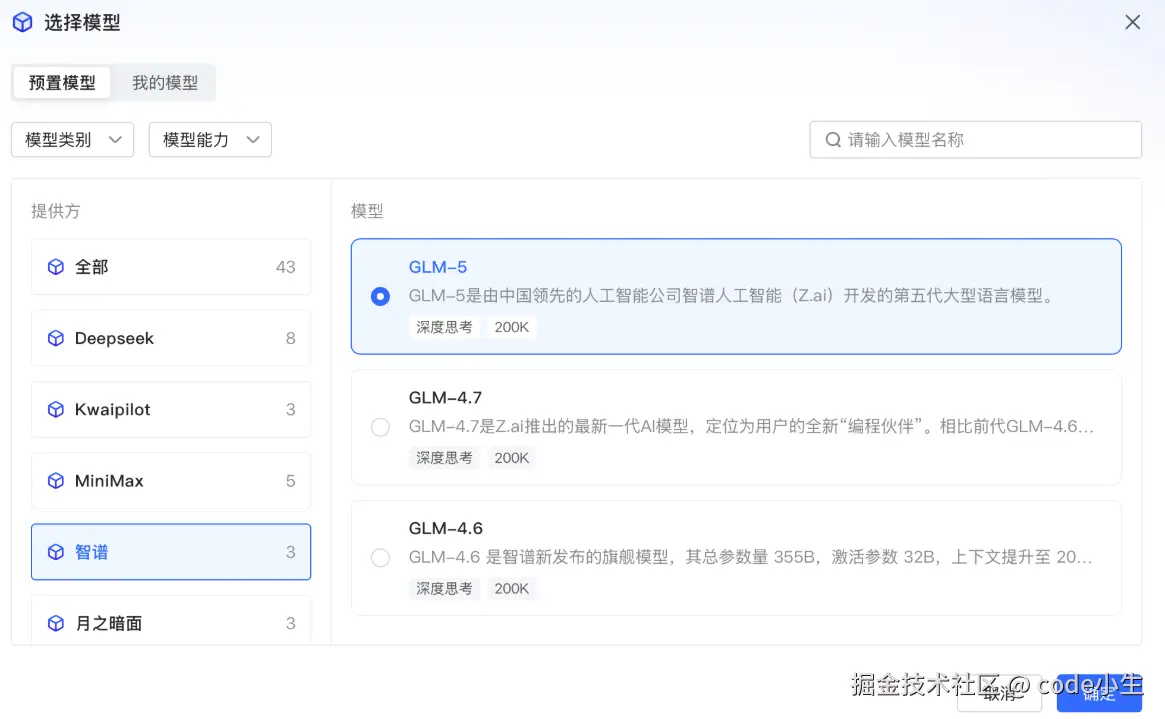 选择所需模型并点击“确定”,可以按需选择不同的大模型,在此以GLM-5举例