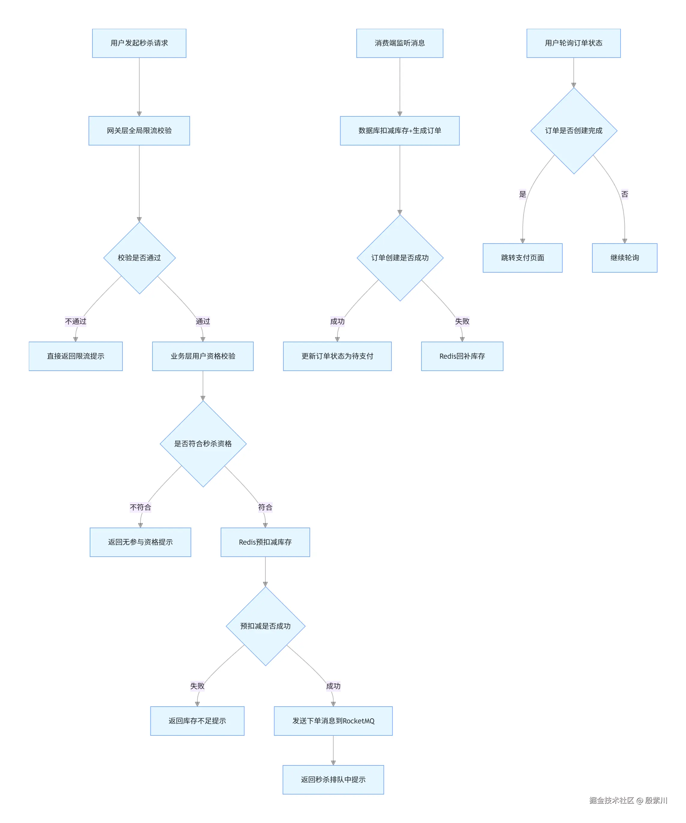 - 资格校验全前置:将用户登录校验、活动时间校验、参与资格校验、重复下单校验全部放在业务逻辑最前端,不符合条件的请求直接返回,不执行后续逻辑