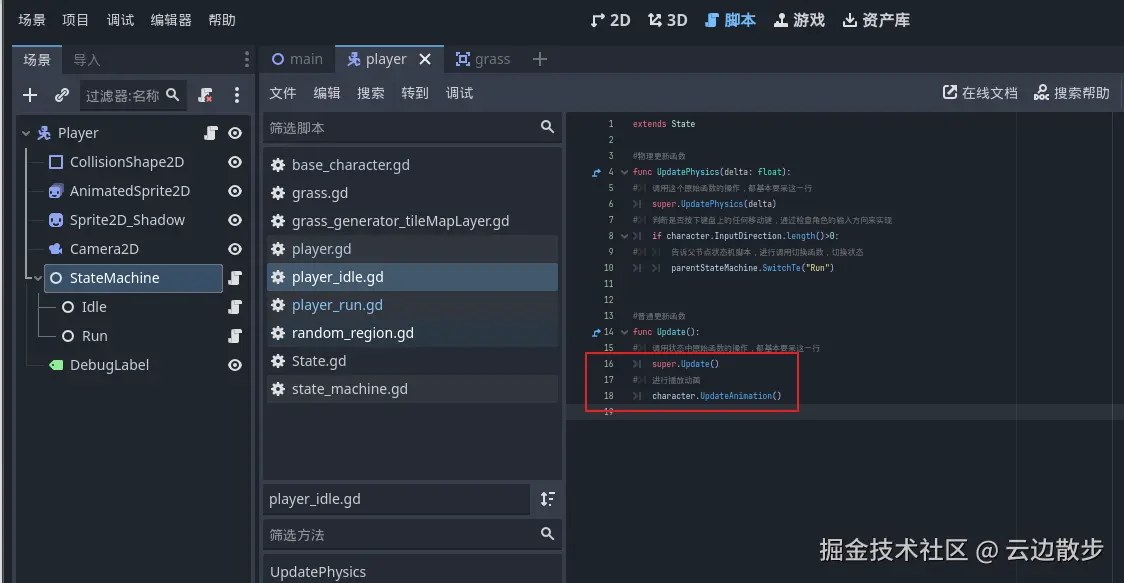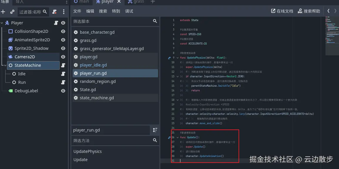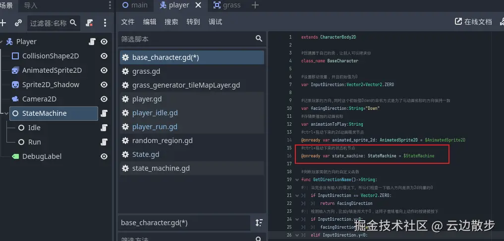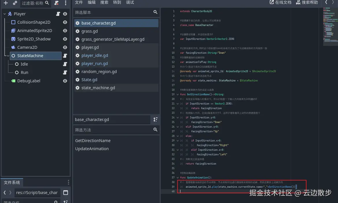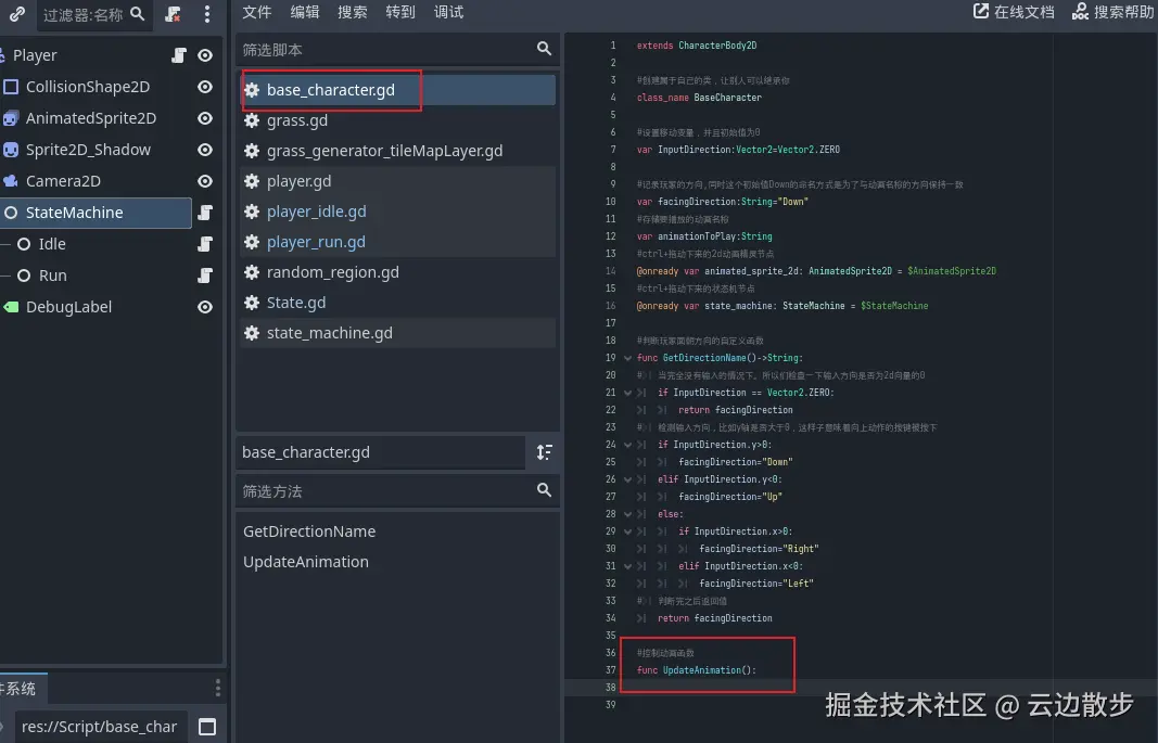 - 在上一个章节中,我们的玩家角色可以移动了然后会切换状态了,但是动画还没播放,这节我们就来解决这个问题。 我们打开基础角色脚本,然后进行创建一个新的函数